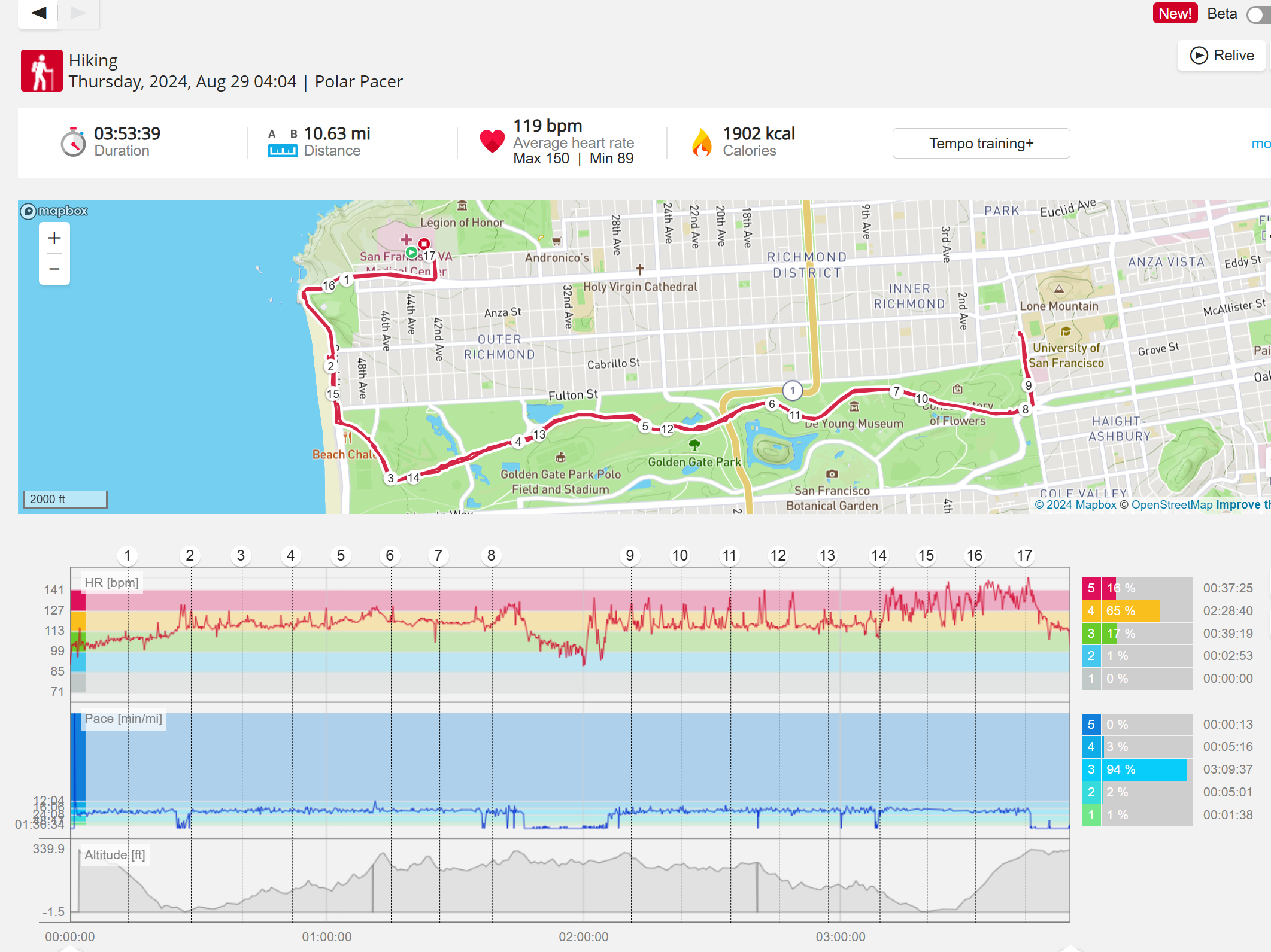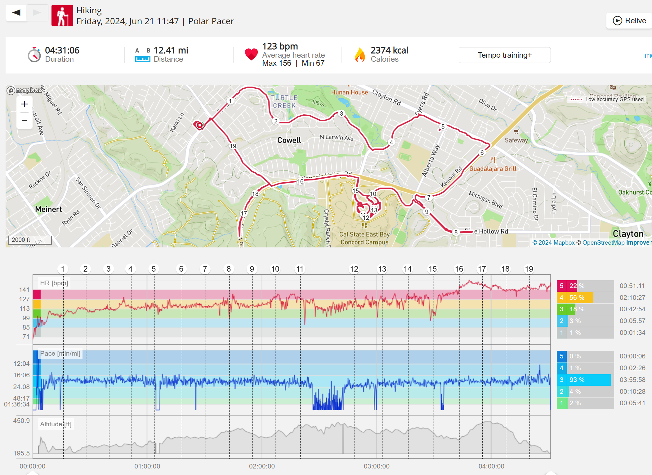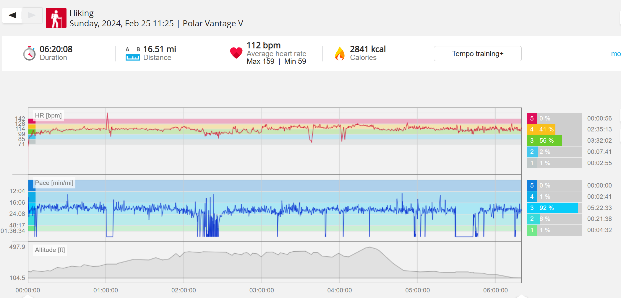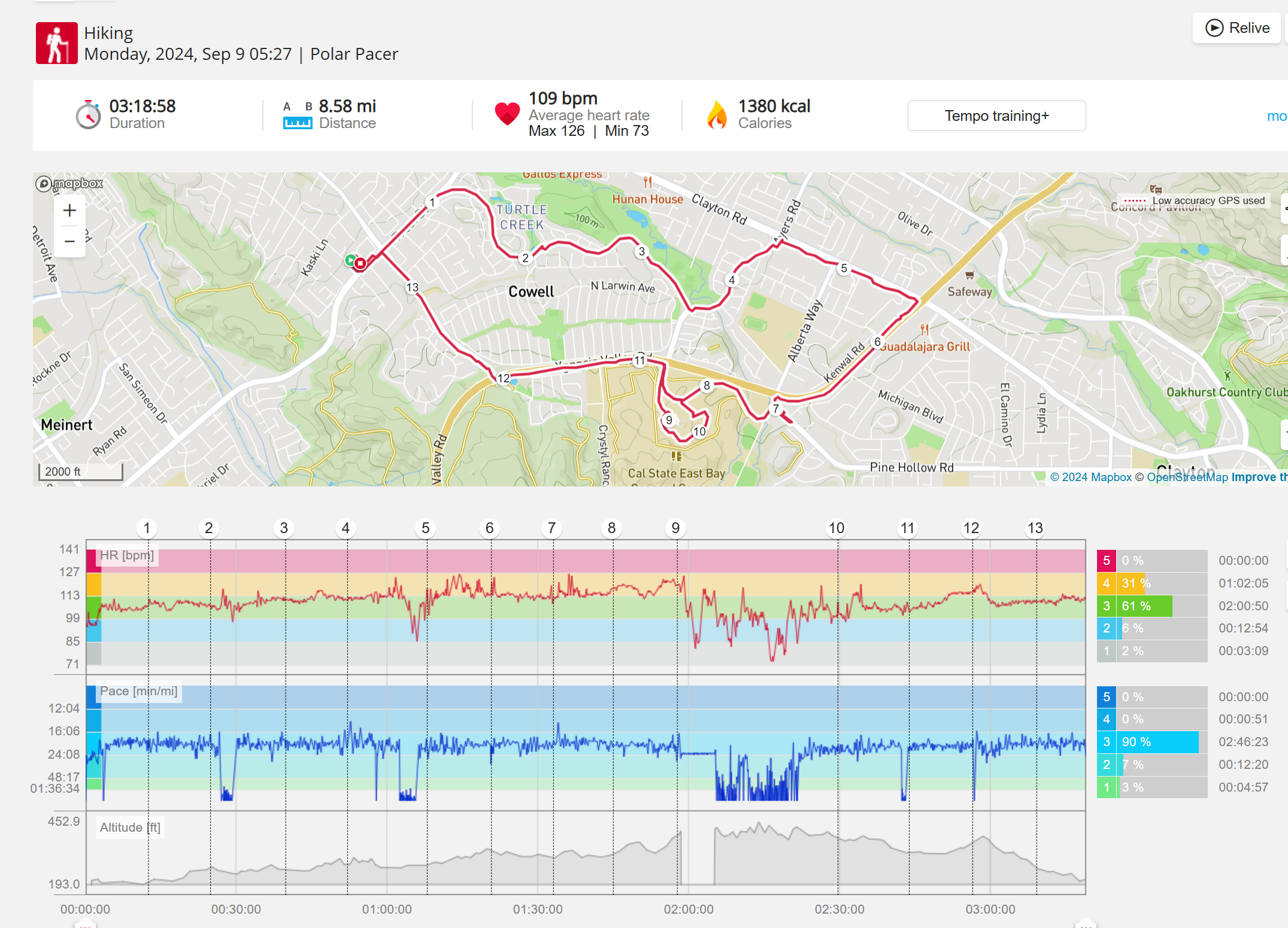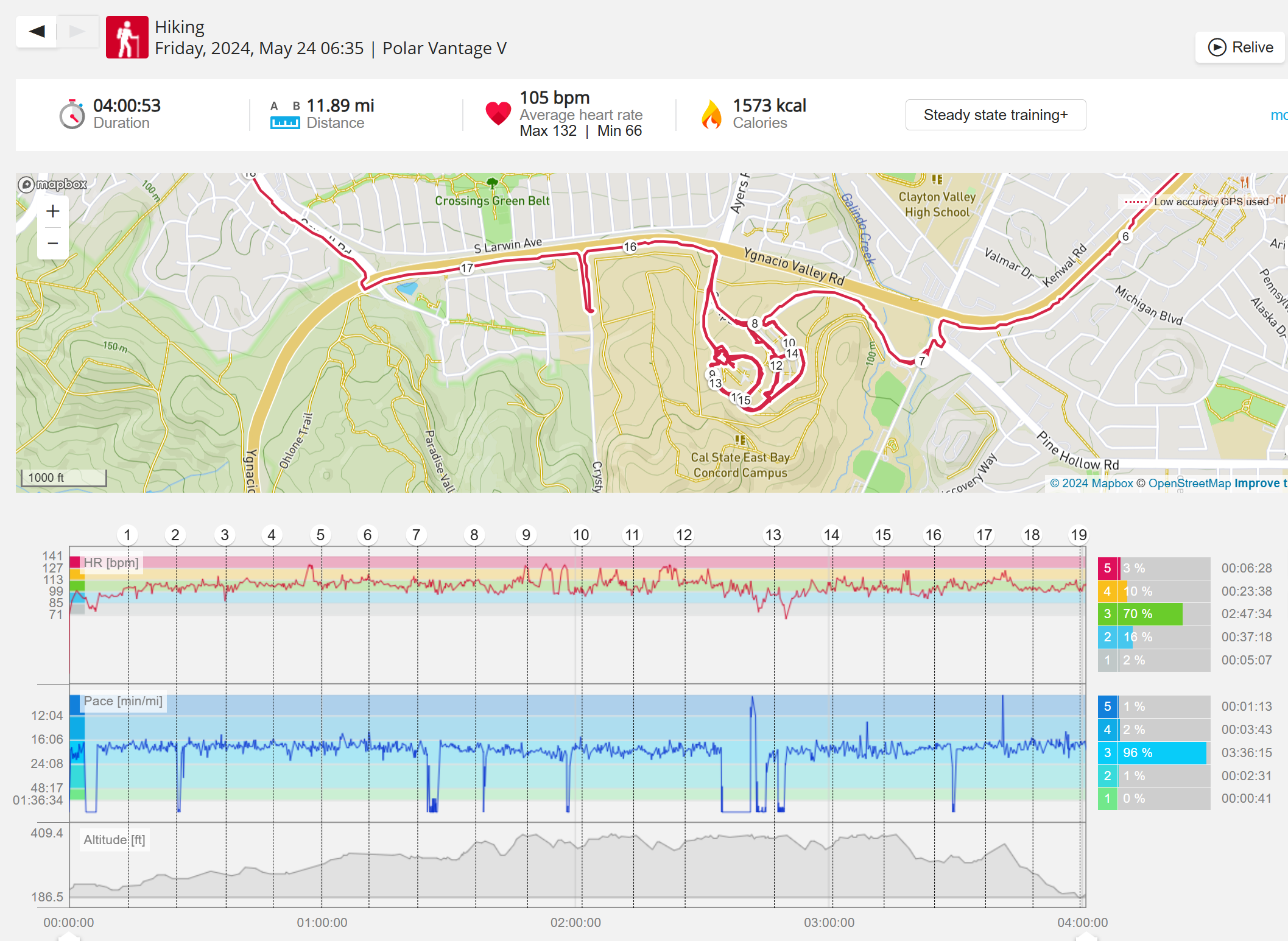 159108 - hiking 00 miles and no continuous extended period steady elevated HR >