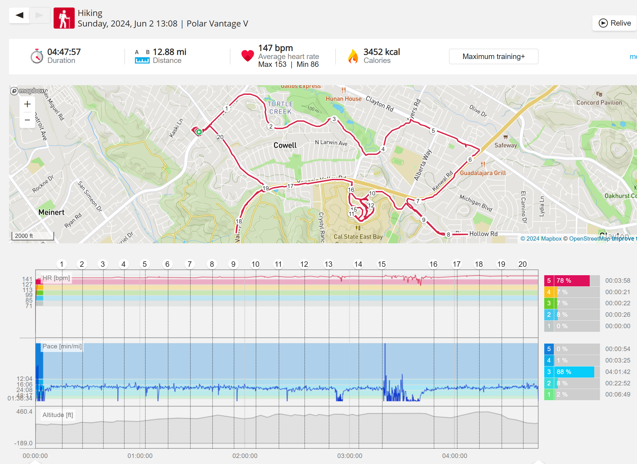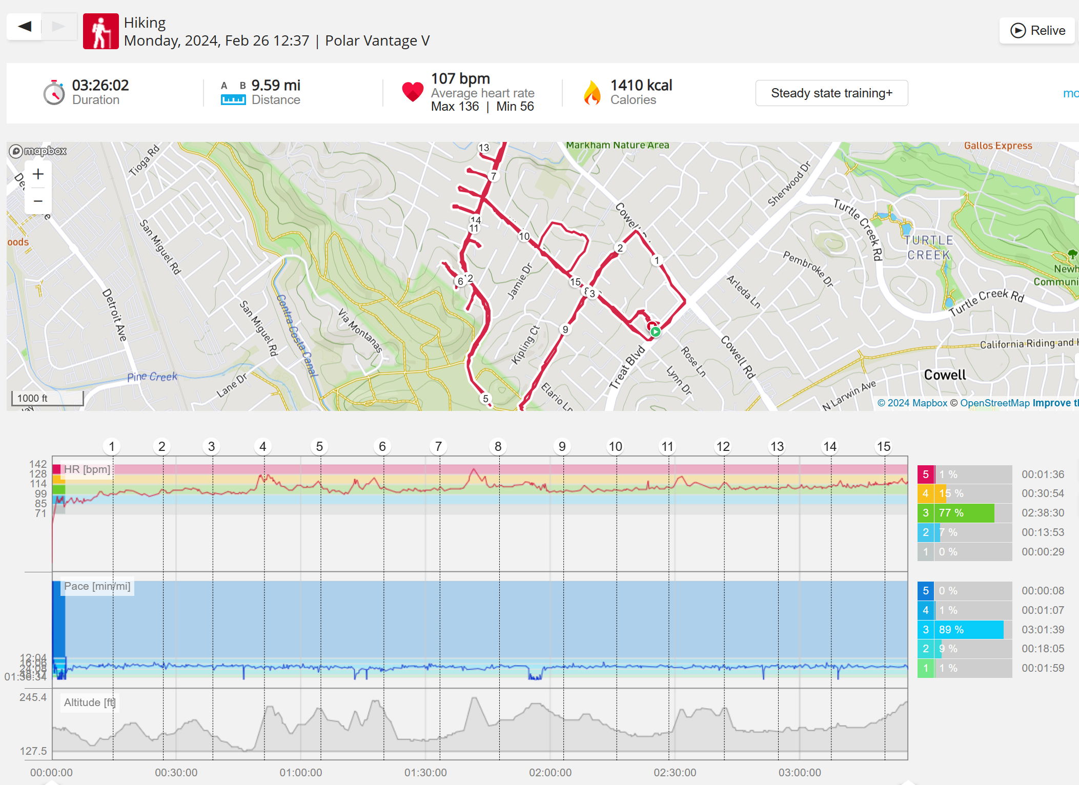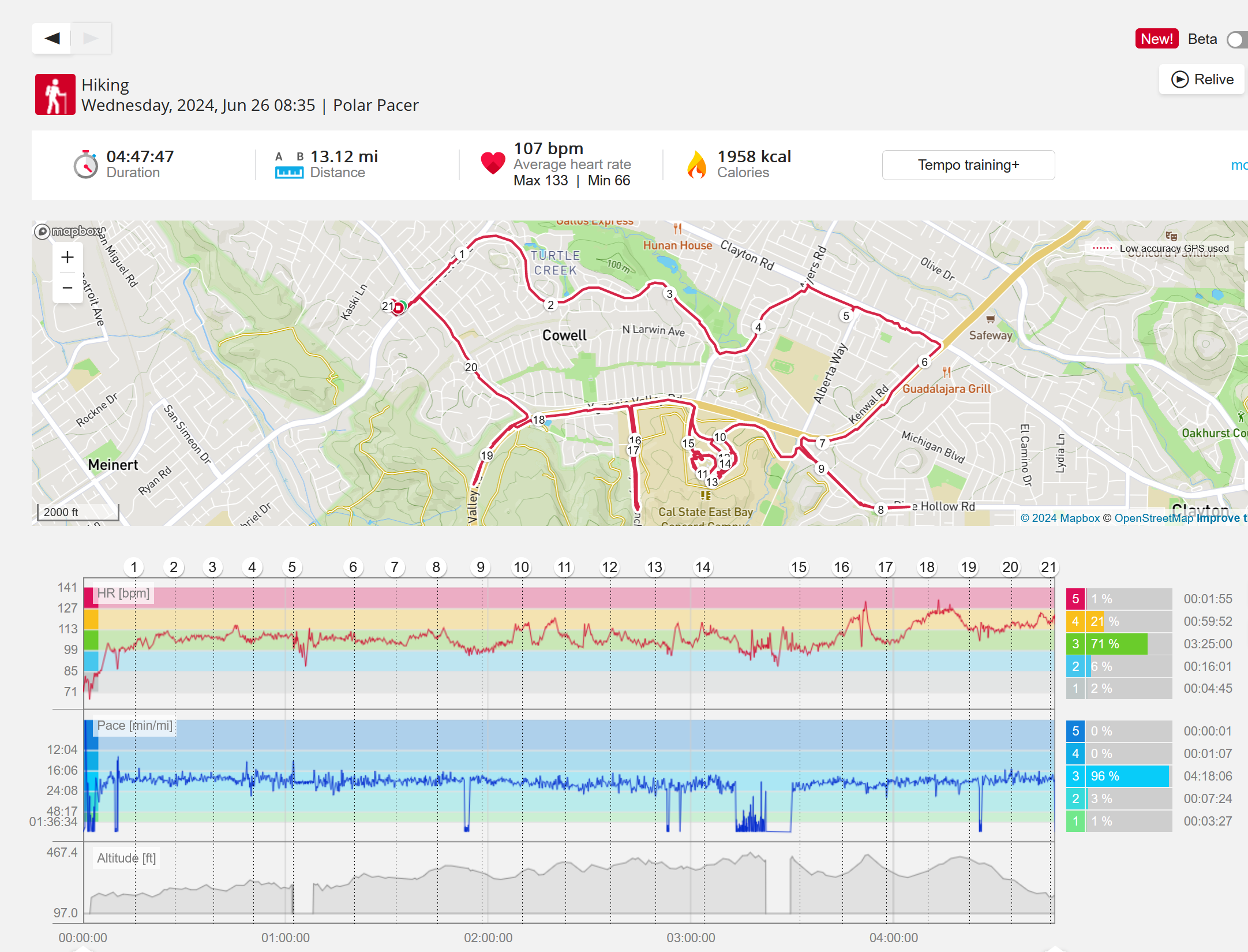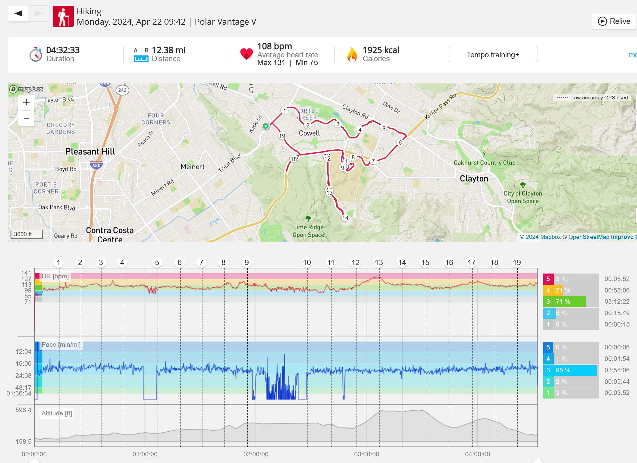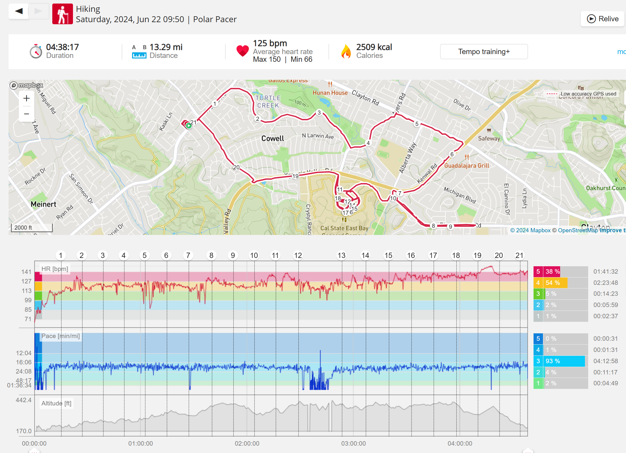 159108 - hiking 00 miles and no continuous extended period steady elevated HR >