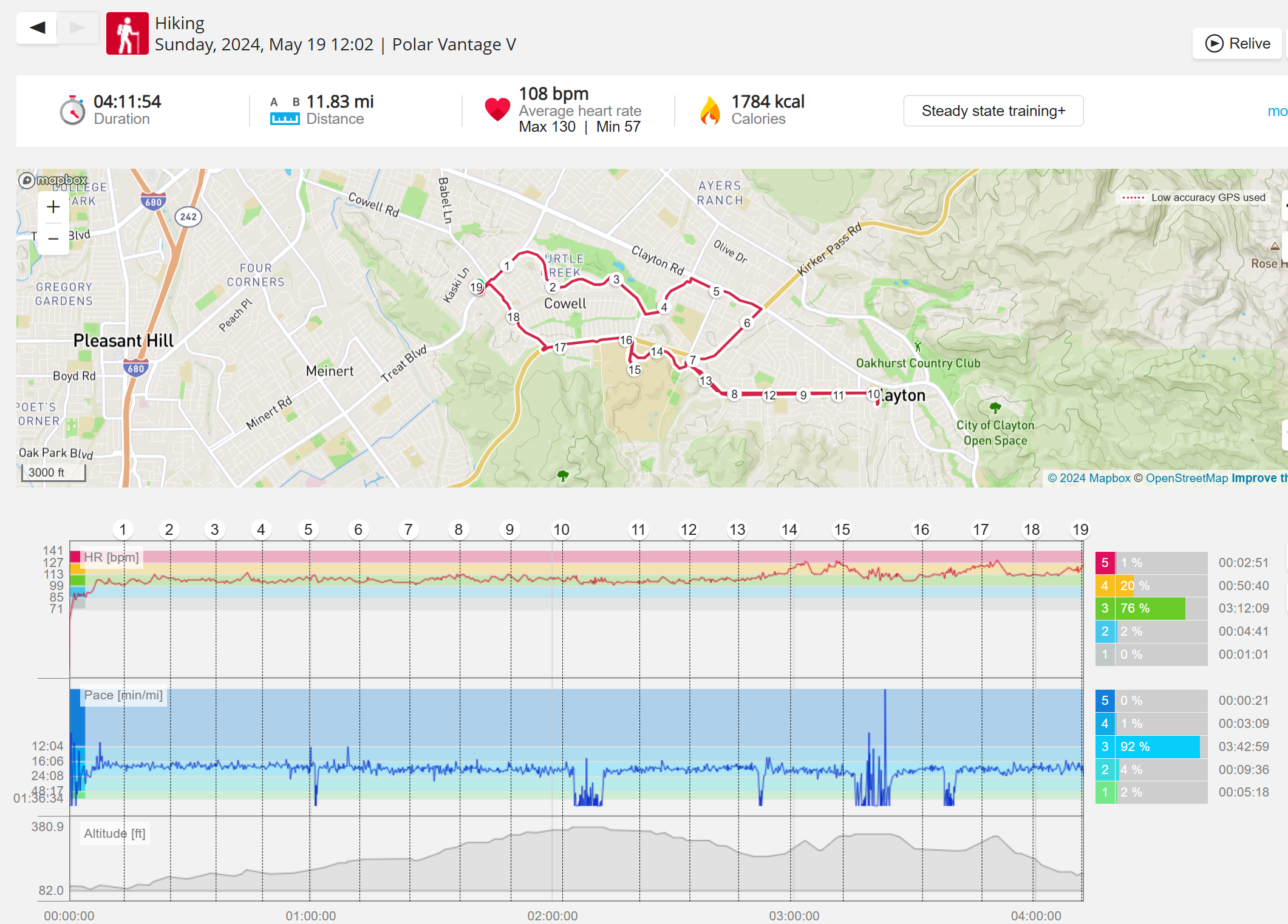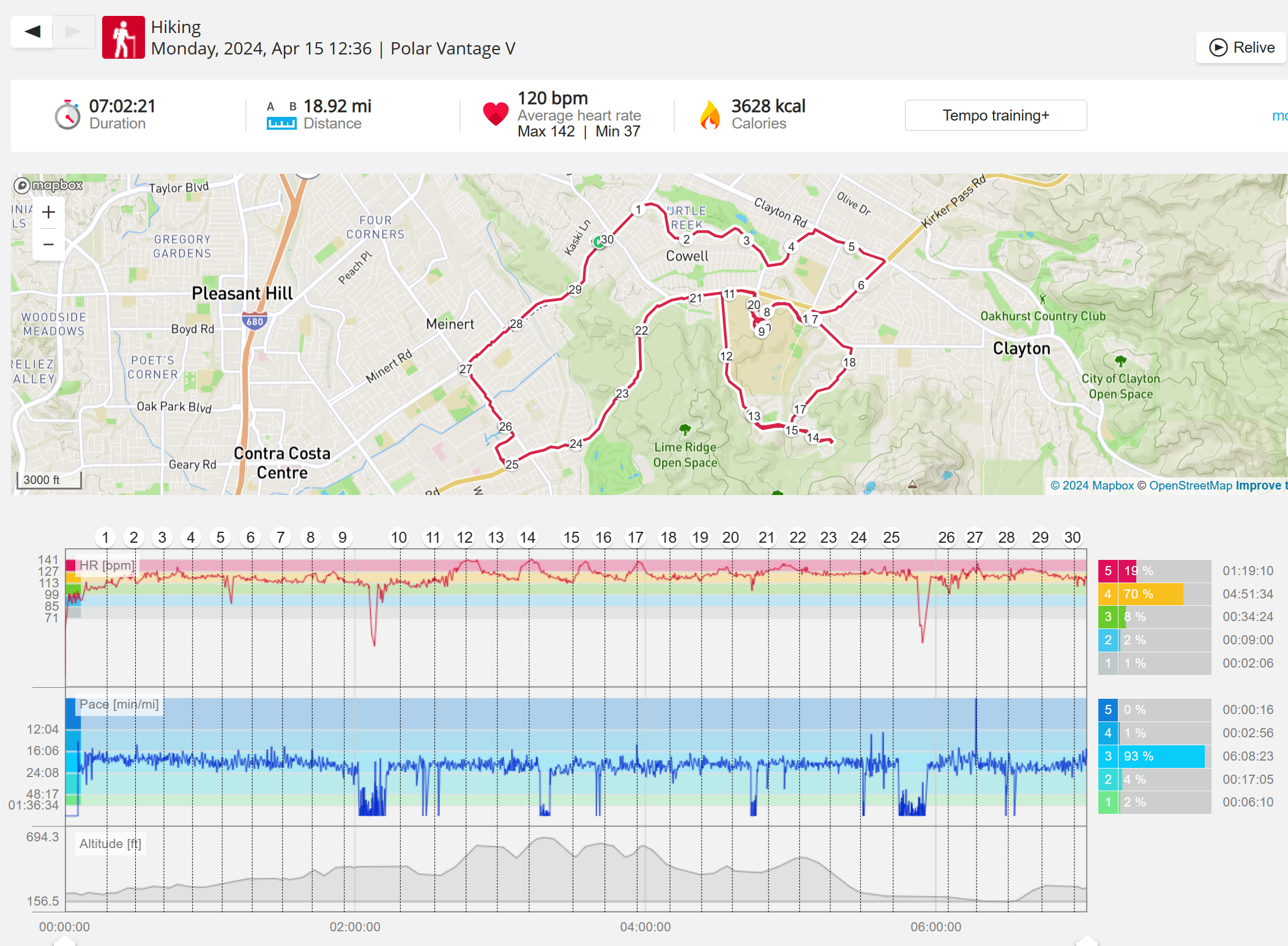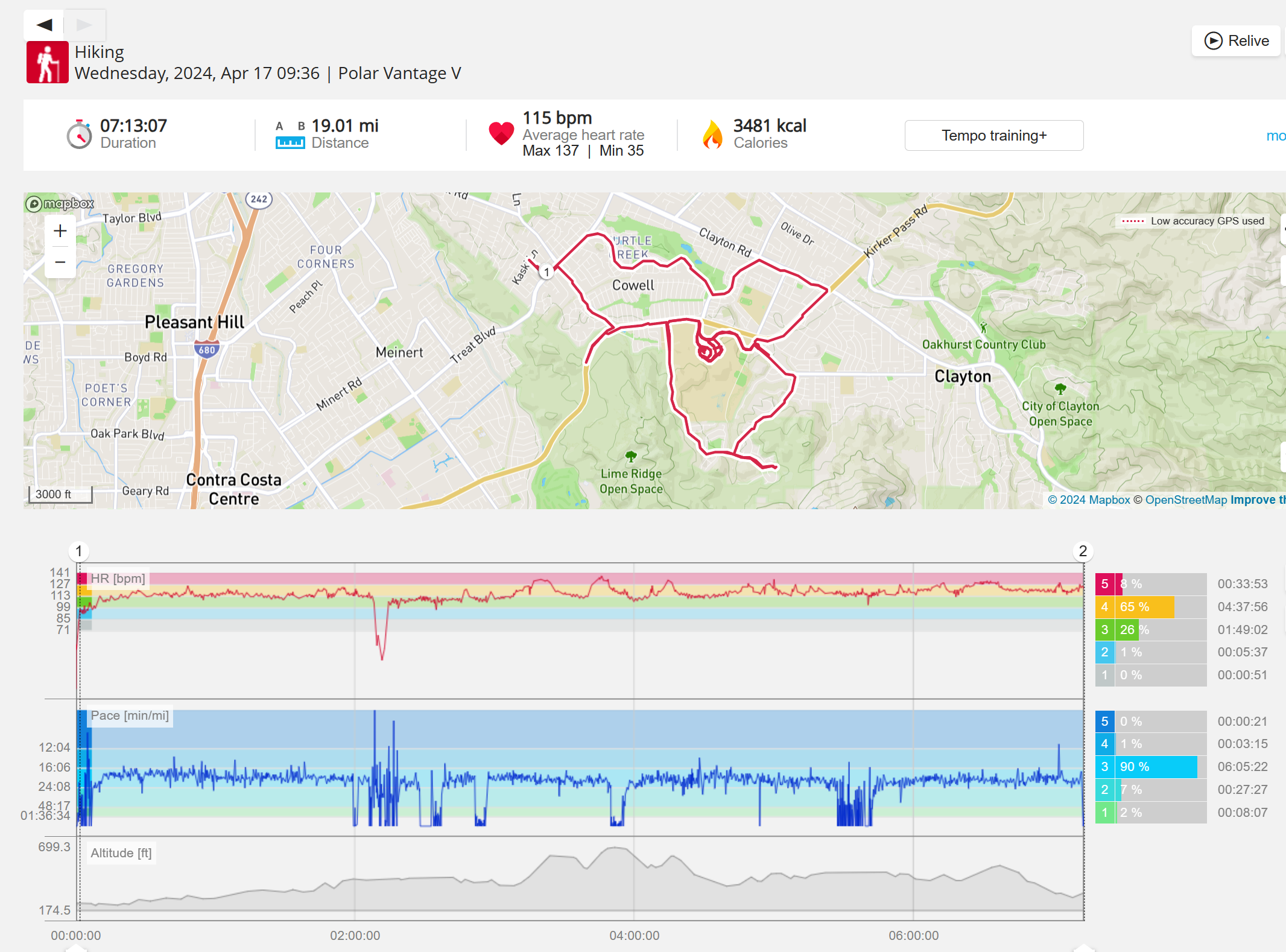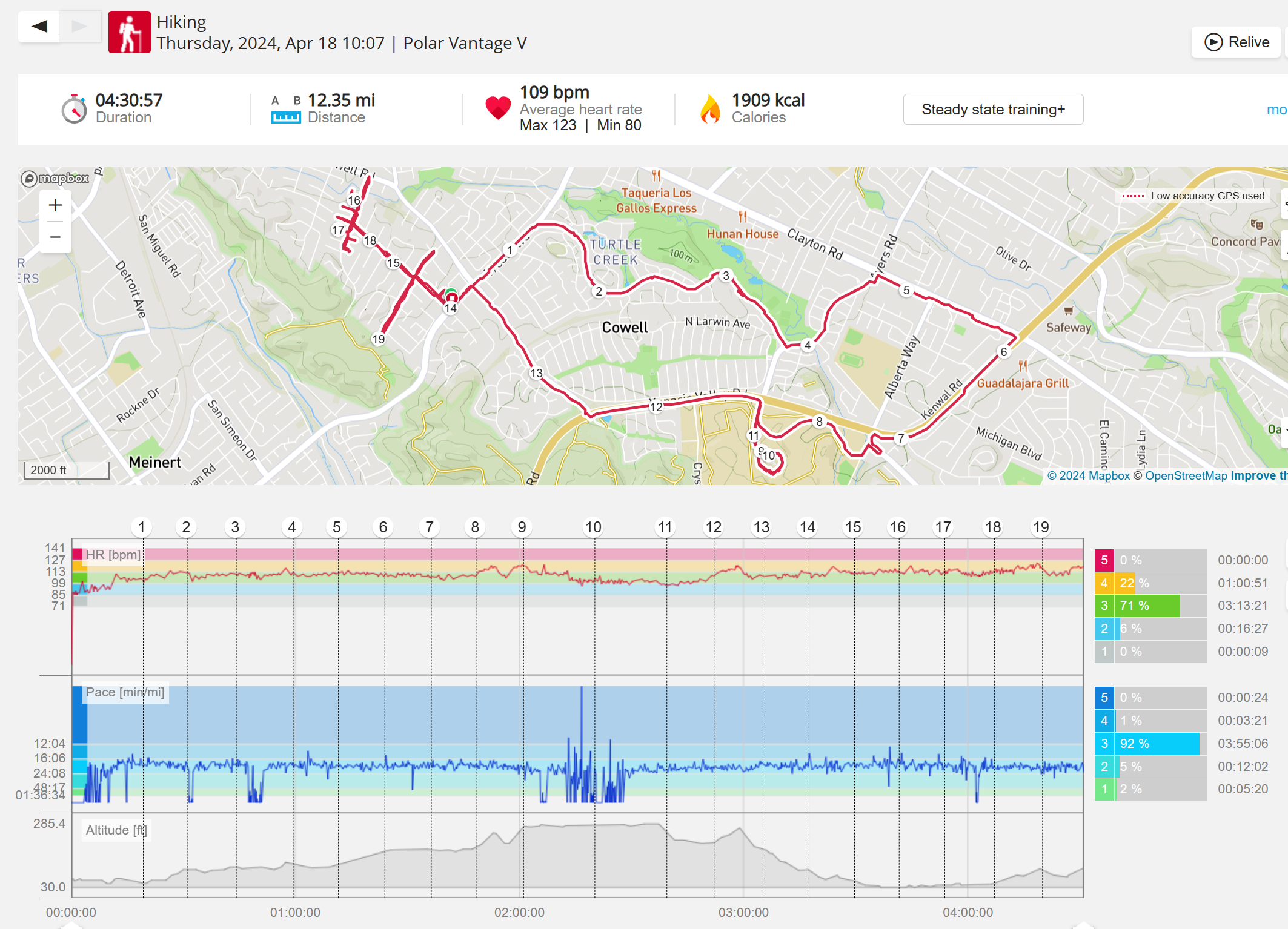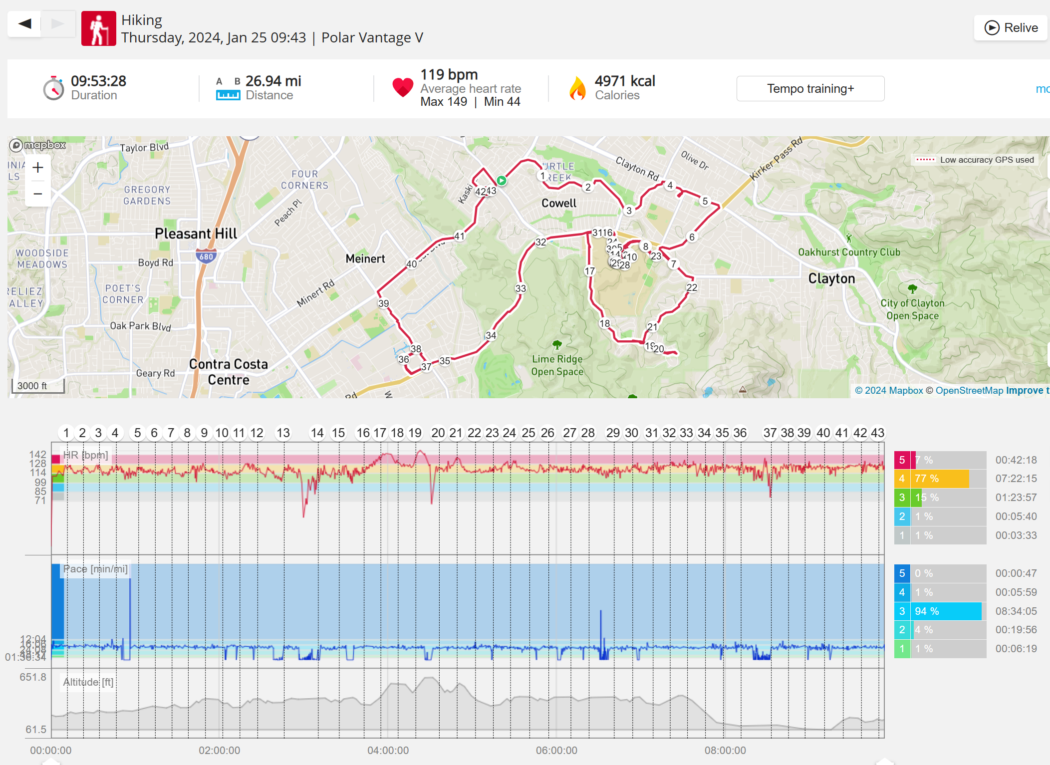159108 - hiking 00 miles and no continuous extended period steady elevated HR >