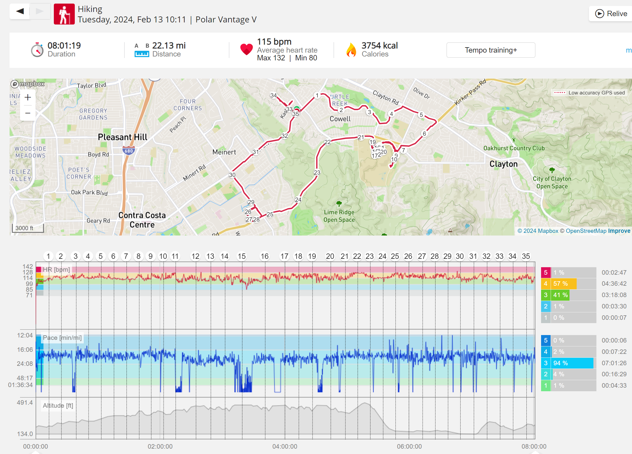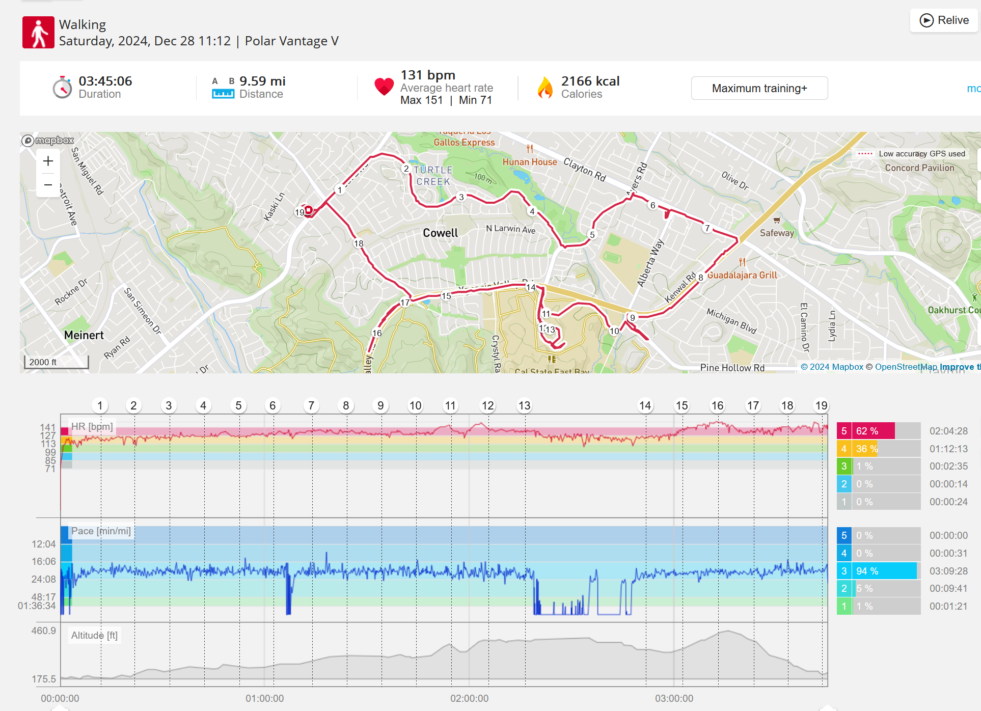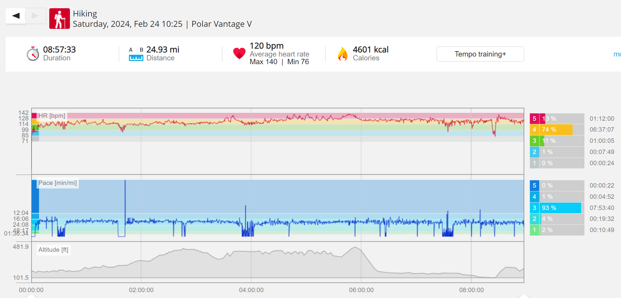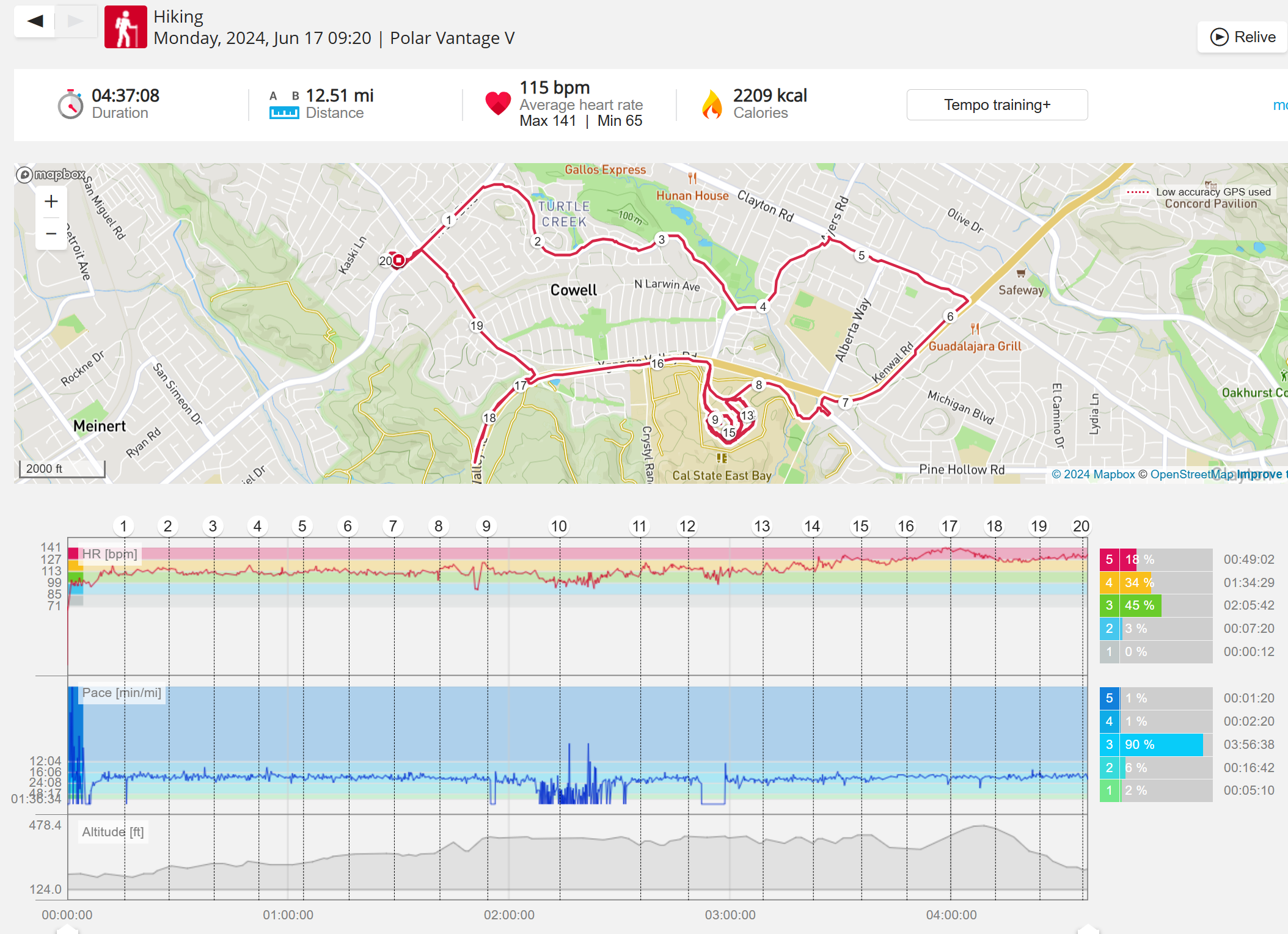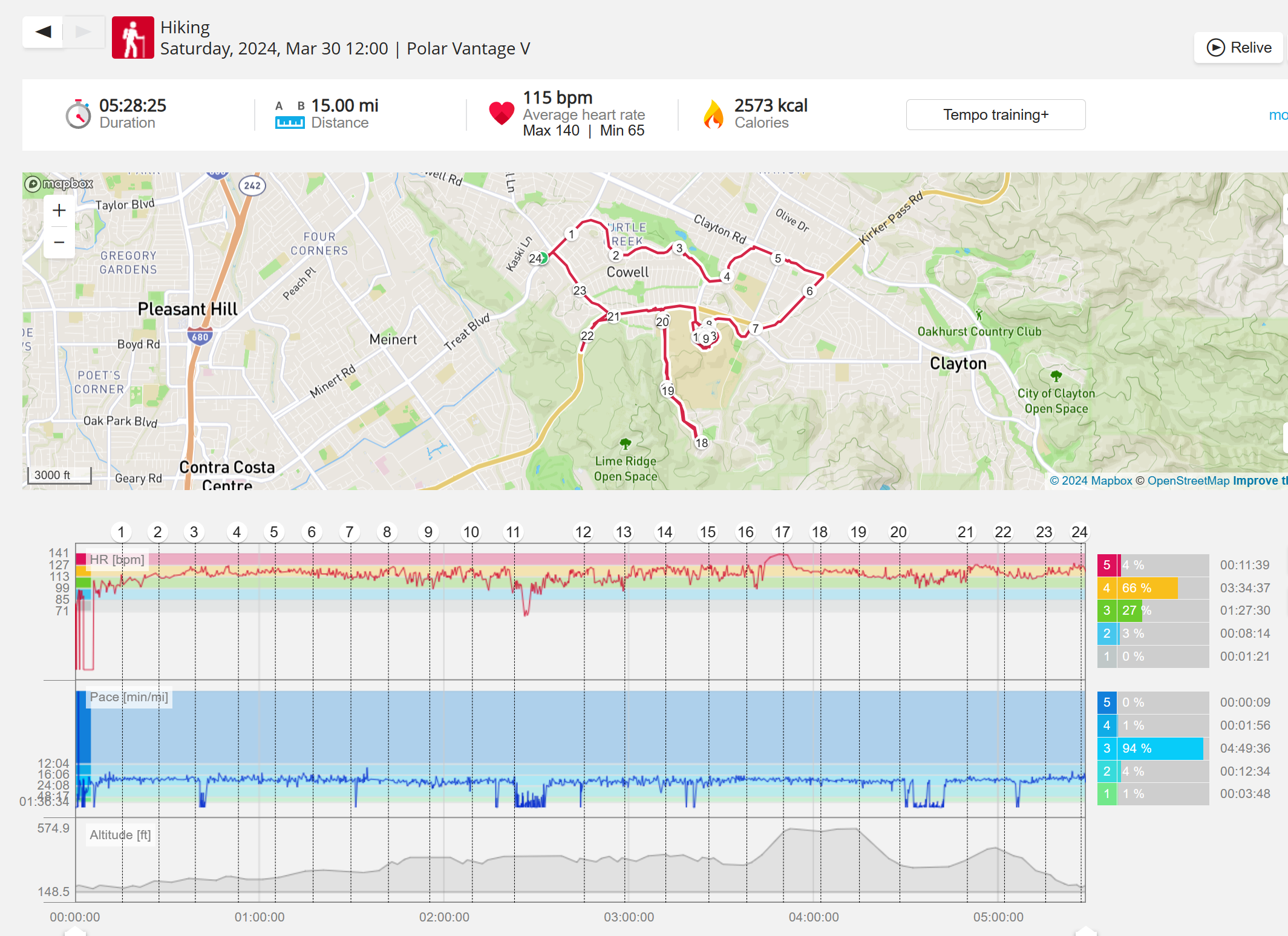 159108 - hiking 00 miles and no continuous extended period steady elevated HR >