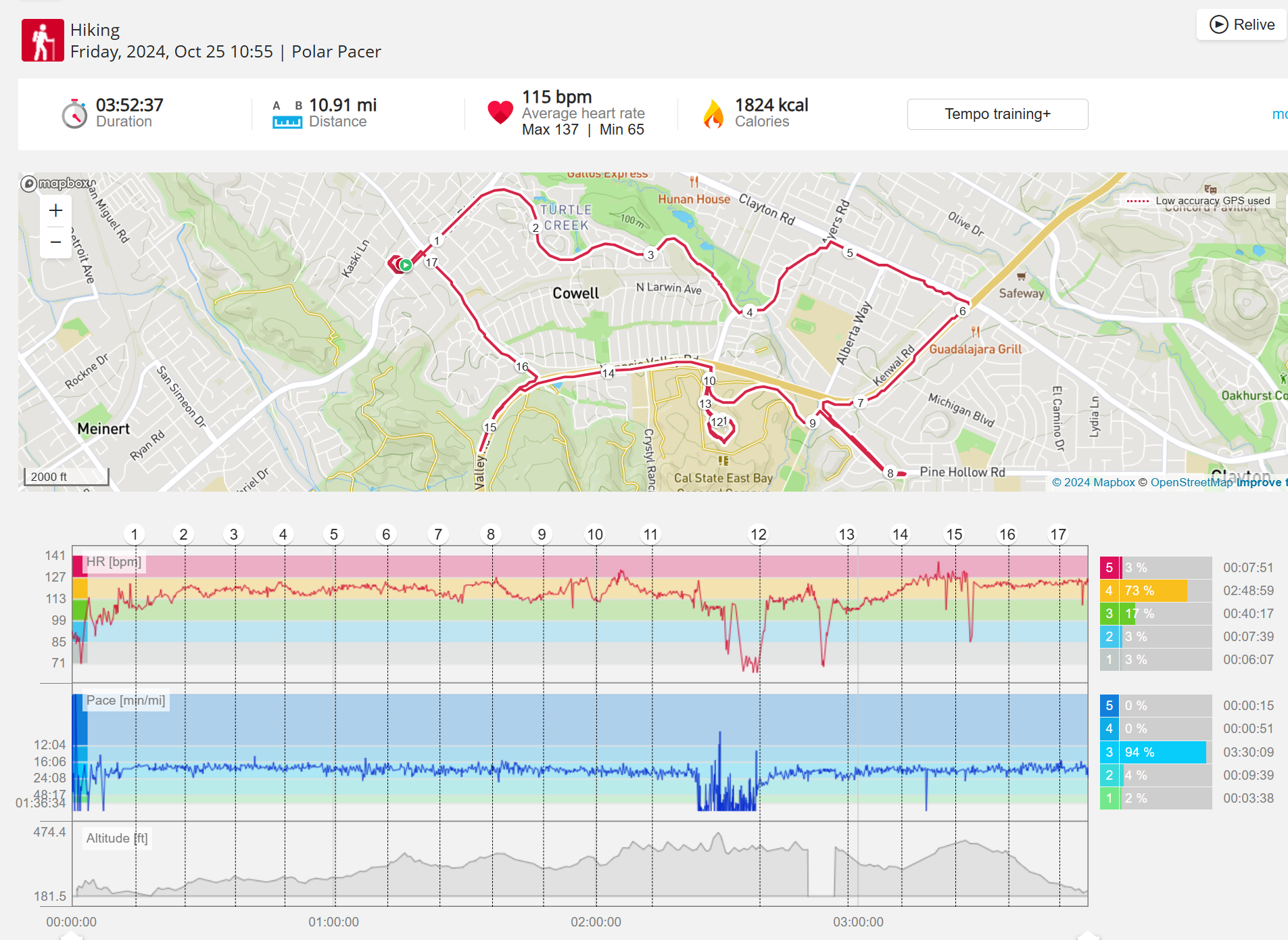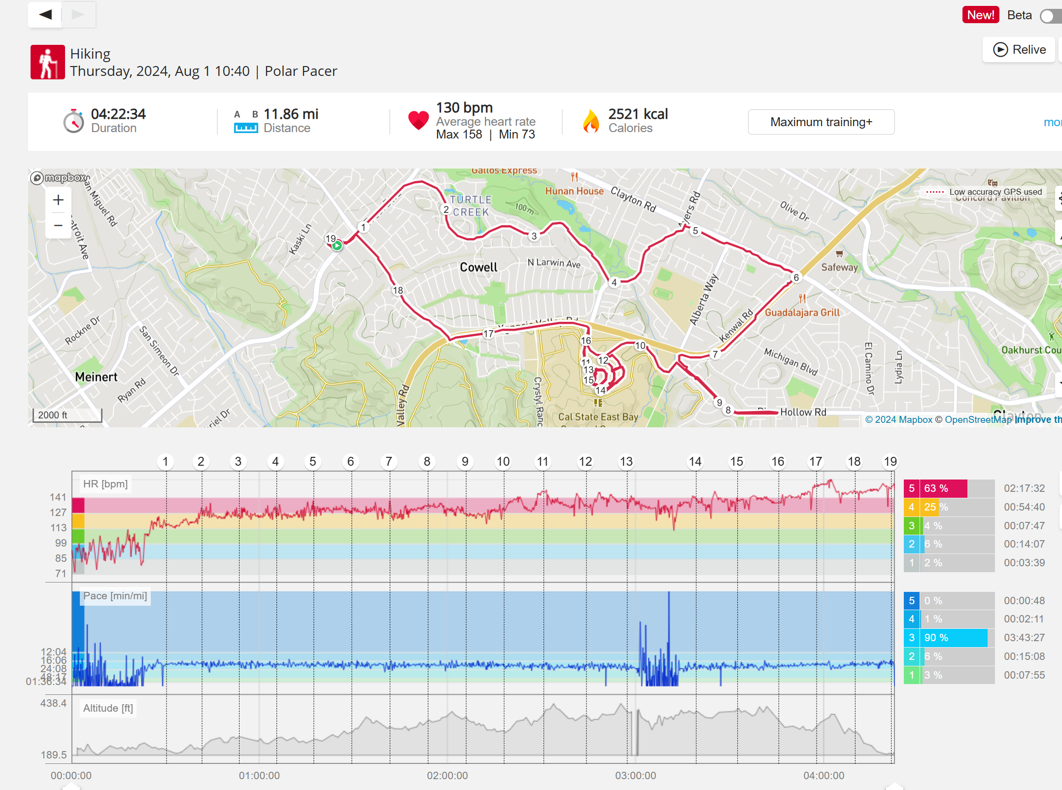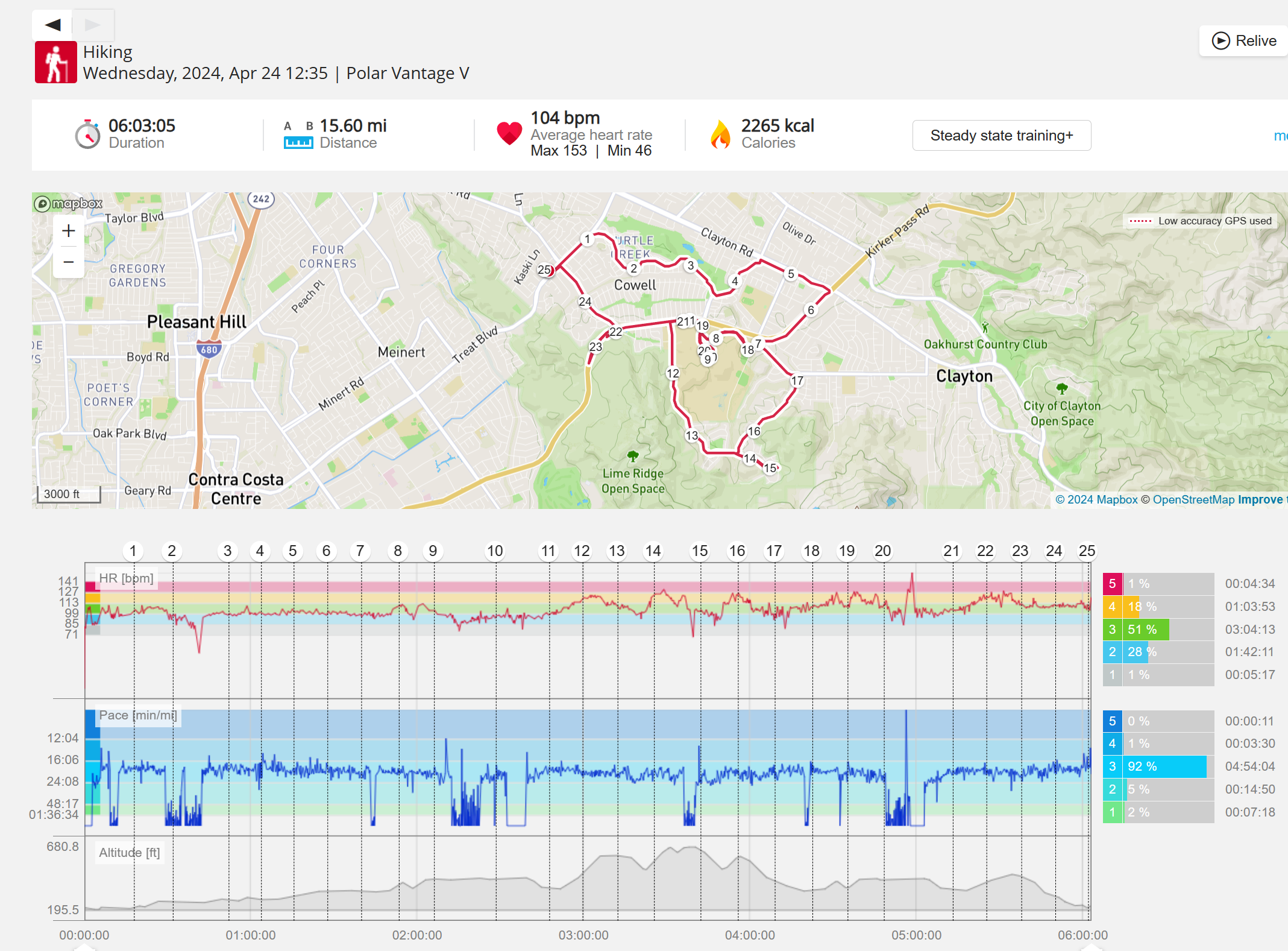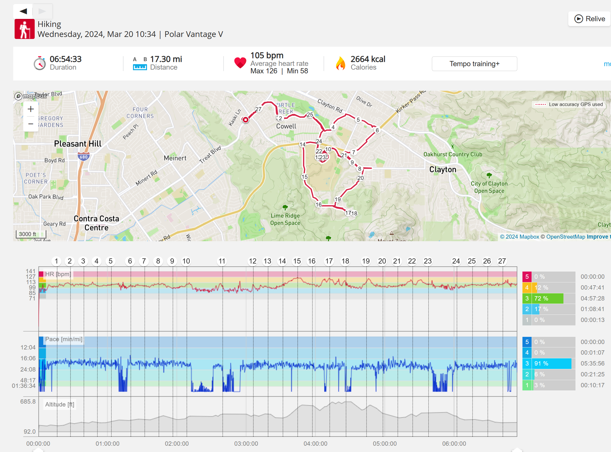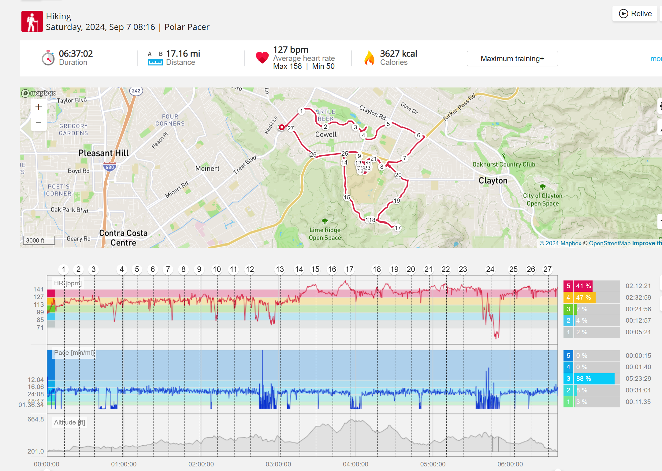 159108 - hiking 00 miles and no continuous extended period steady elevated HR >