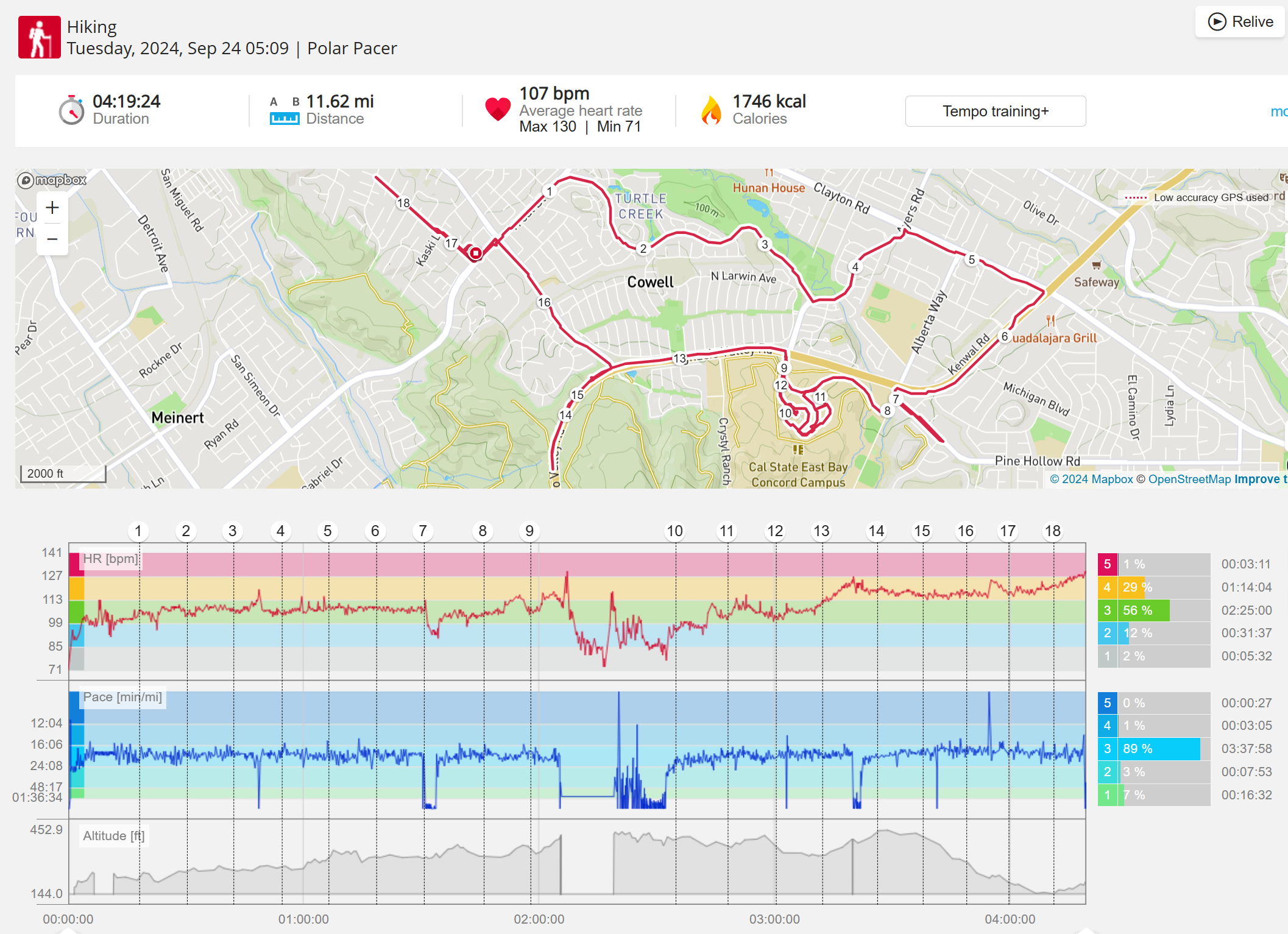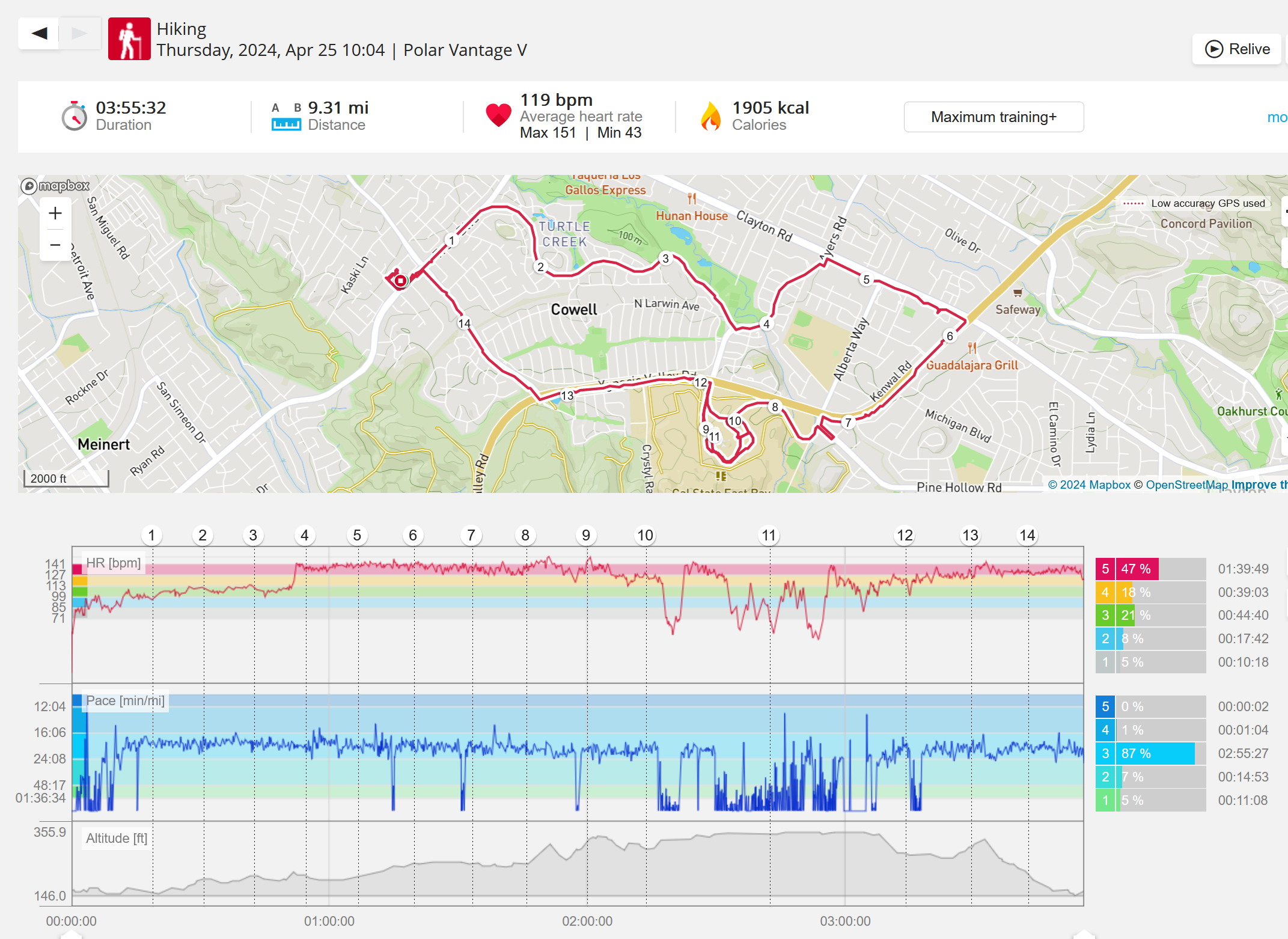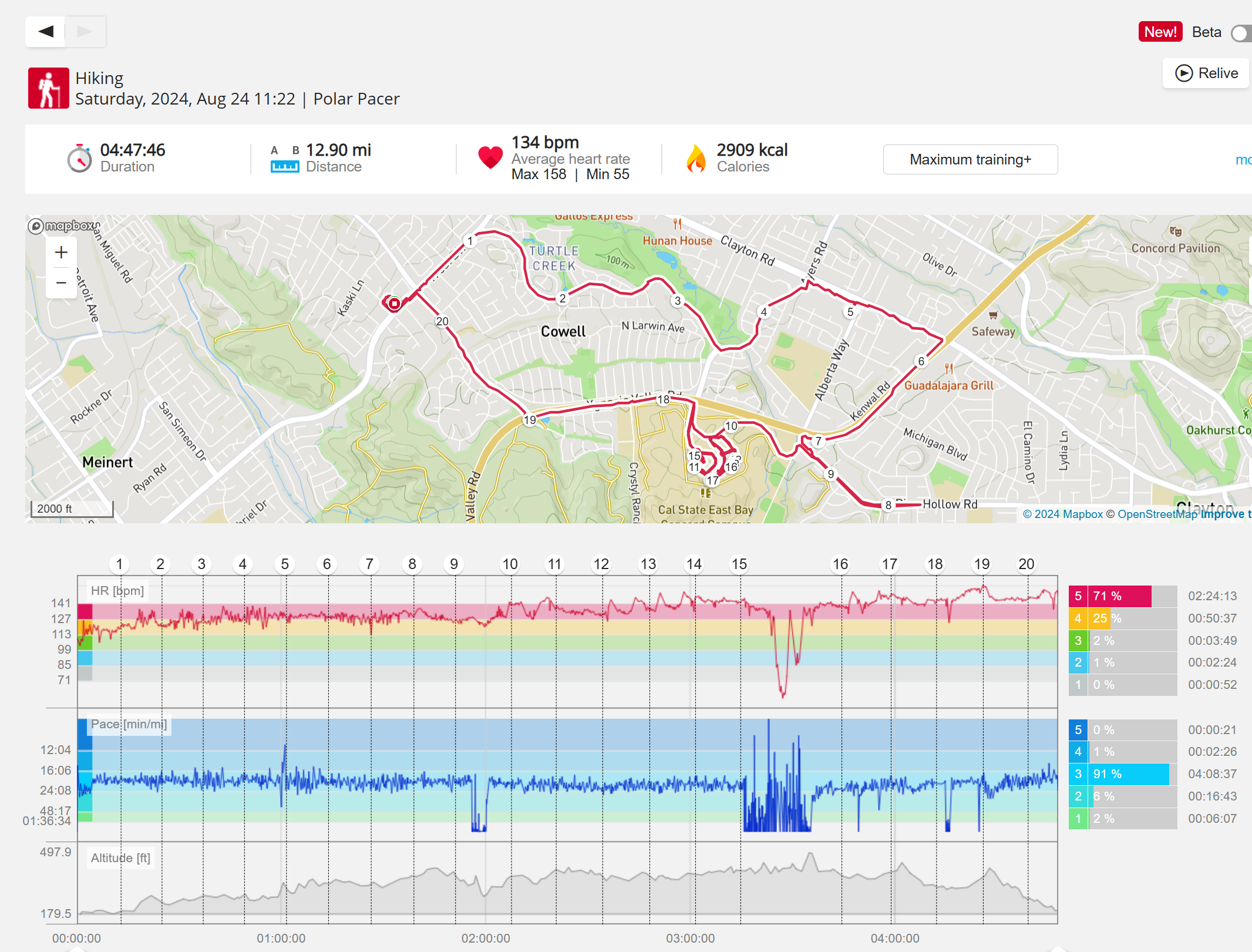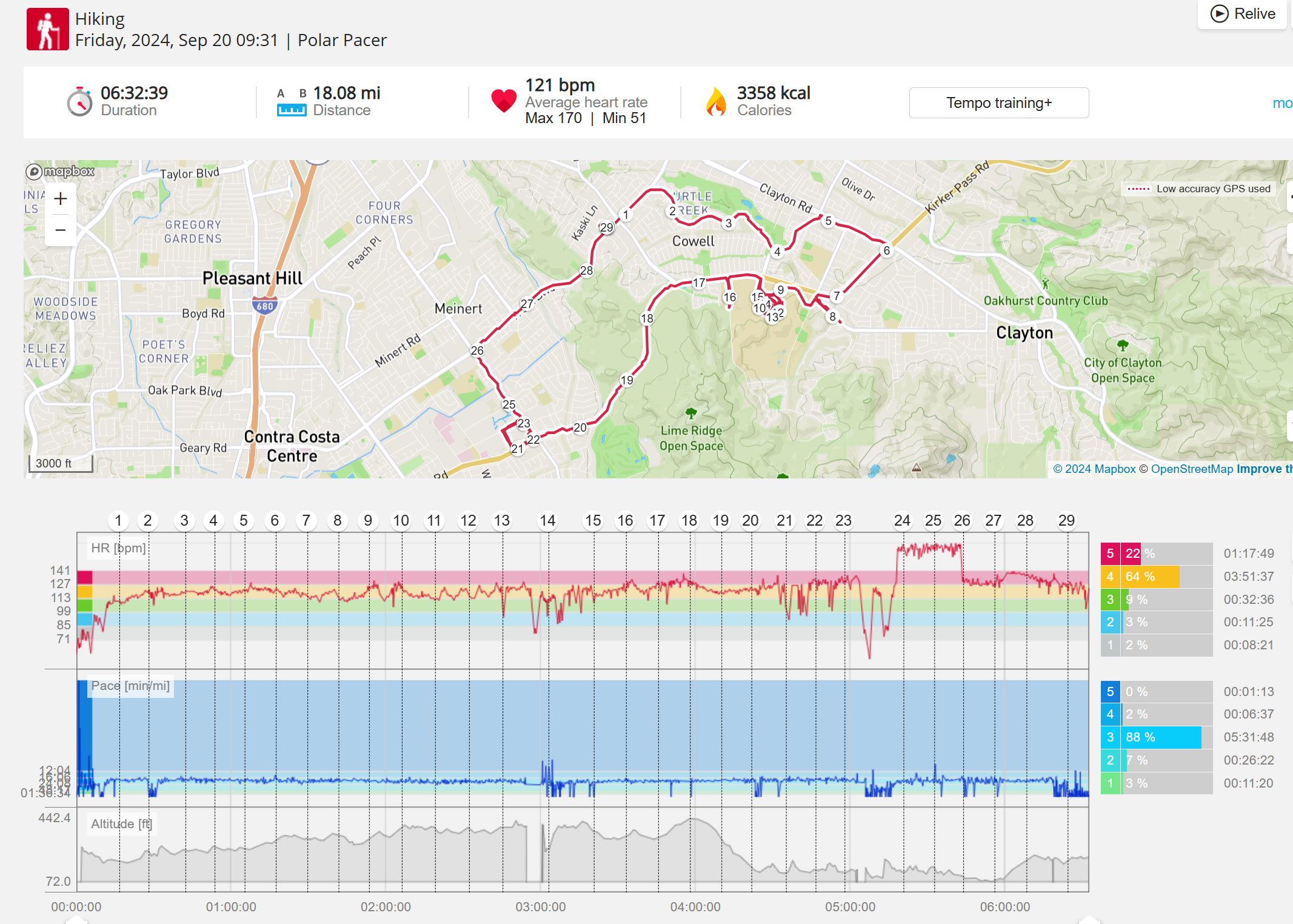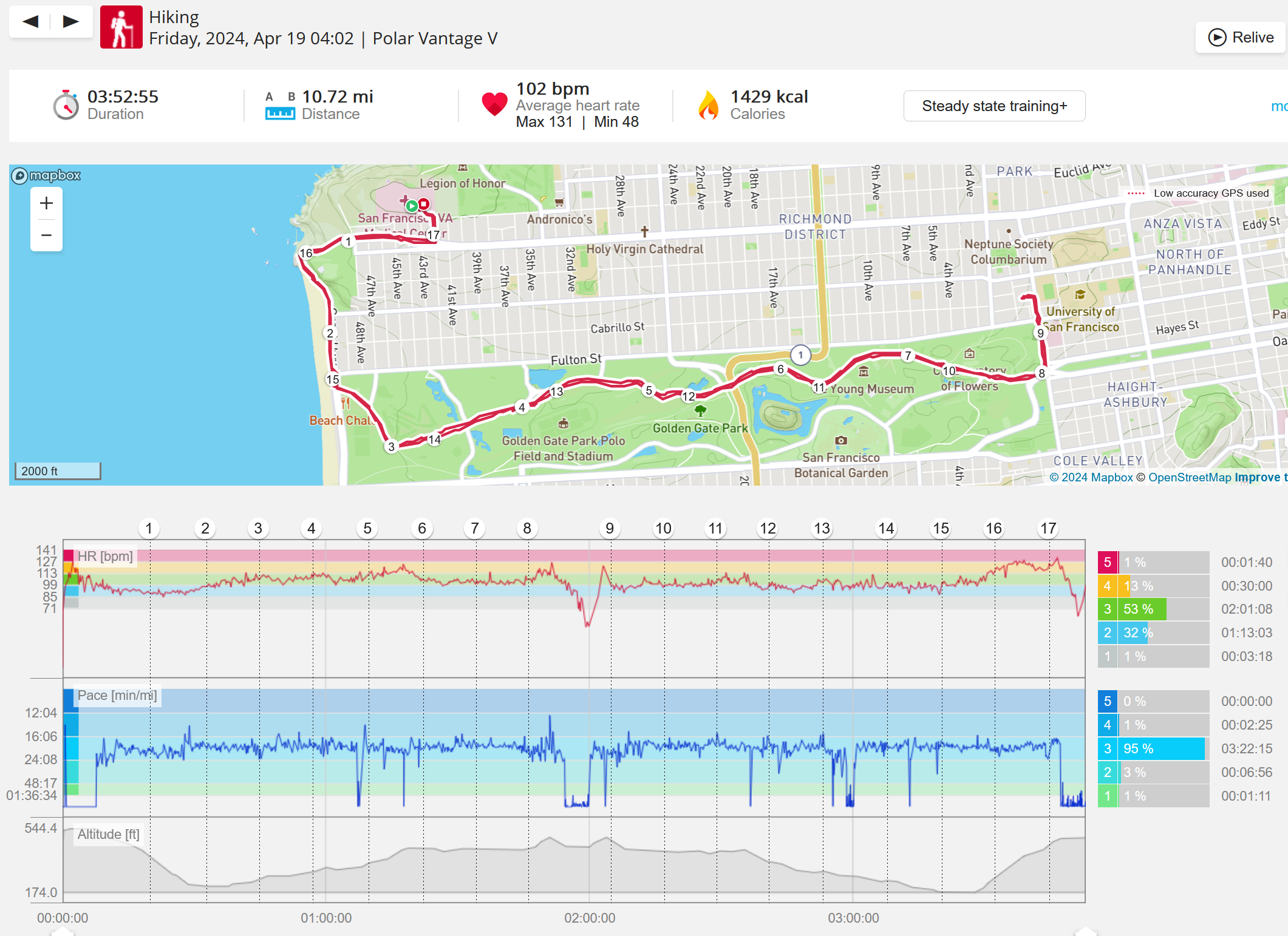 159108 - hiking 00 miles and no continuous extended period steady elevated HR >