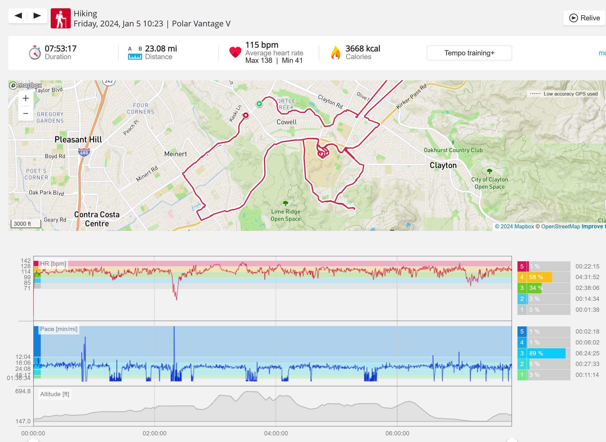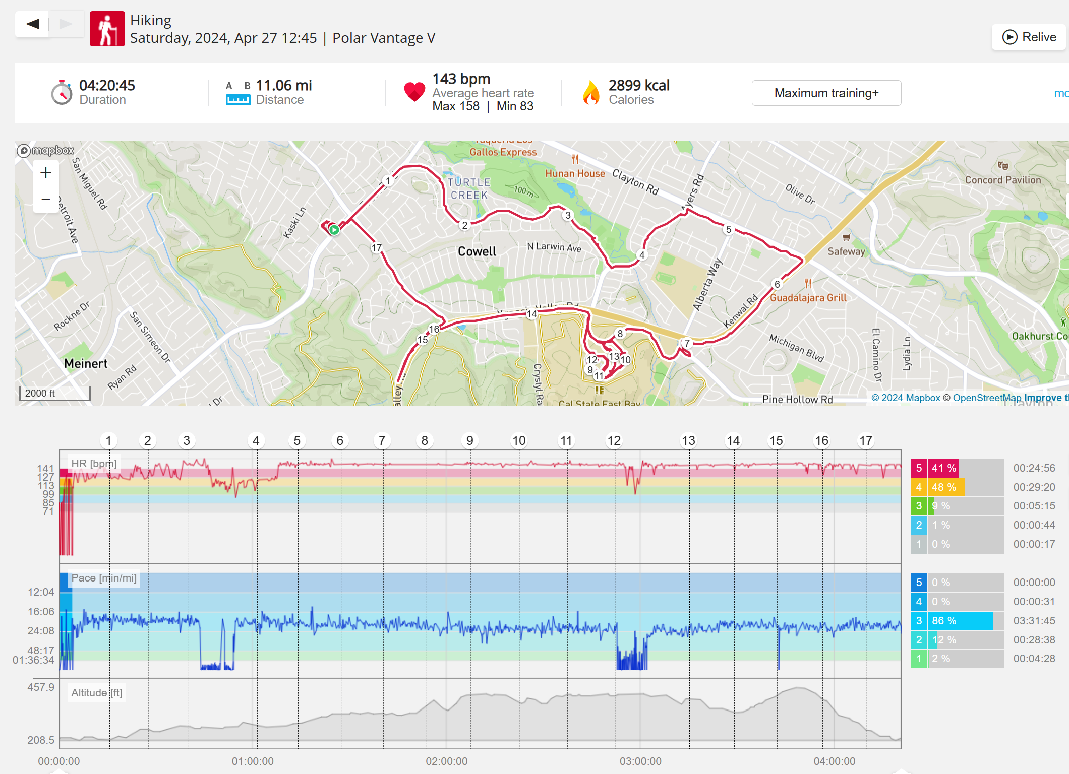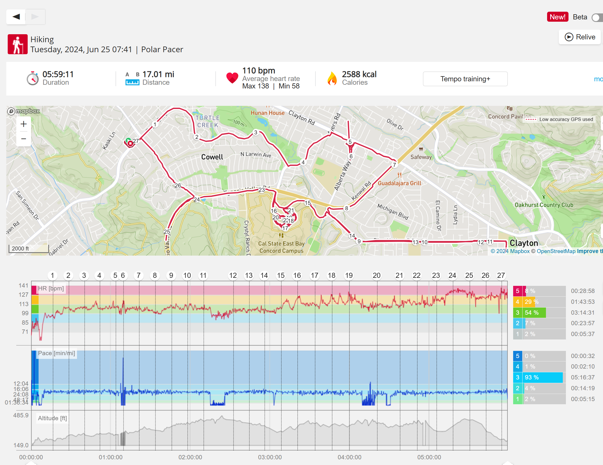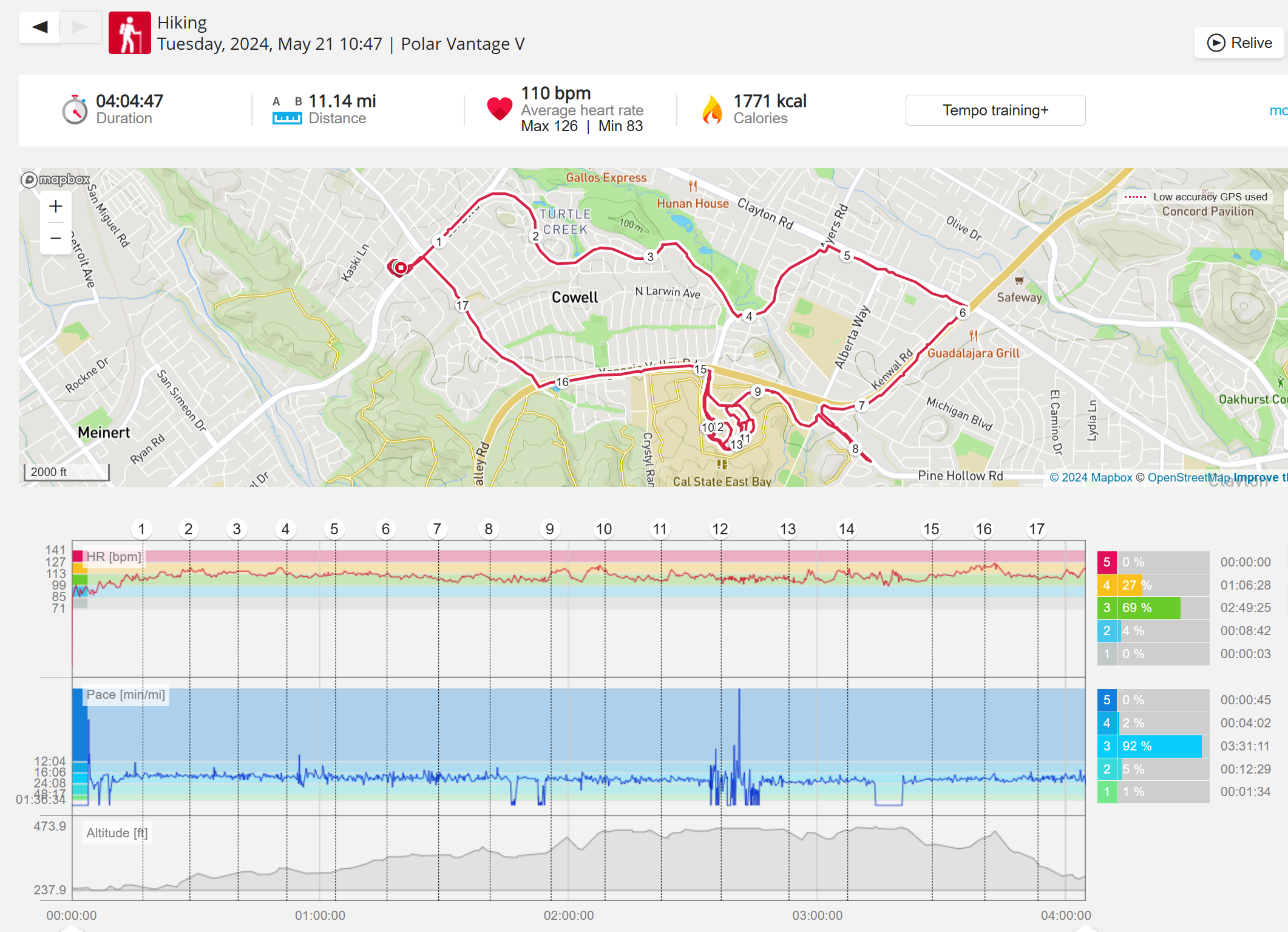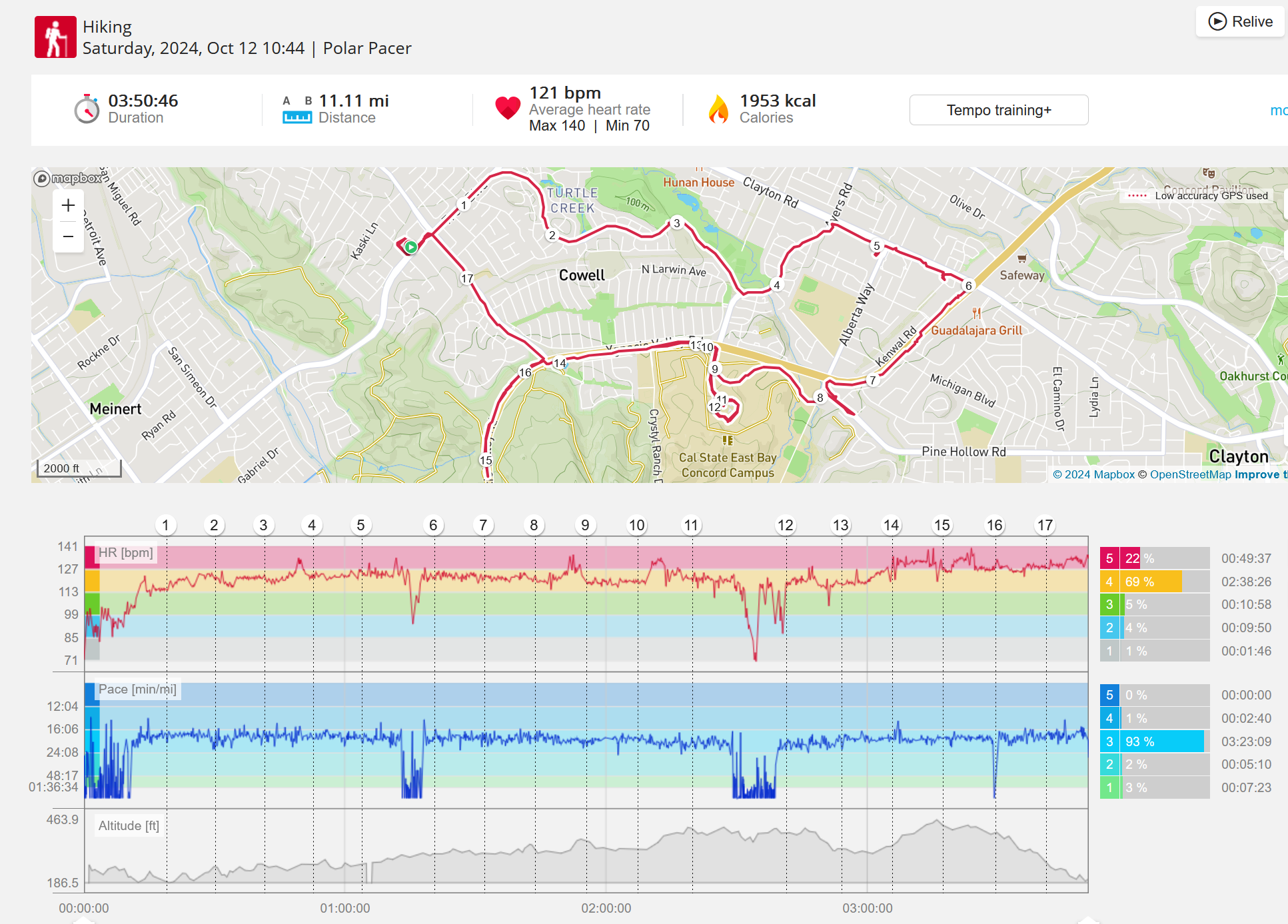 159108 - hiking 00 miles and no continuous extended period steady elevated HR >