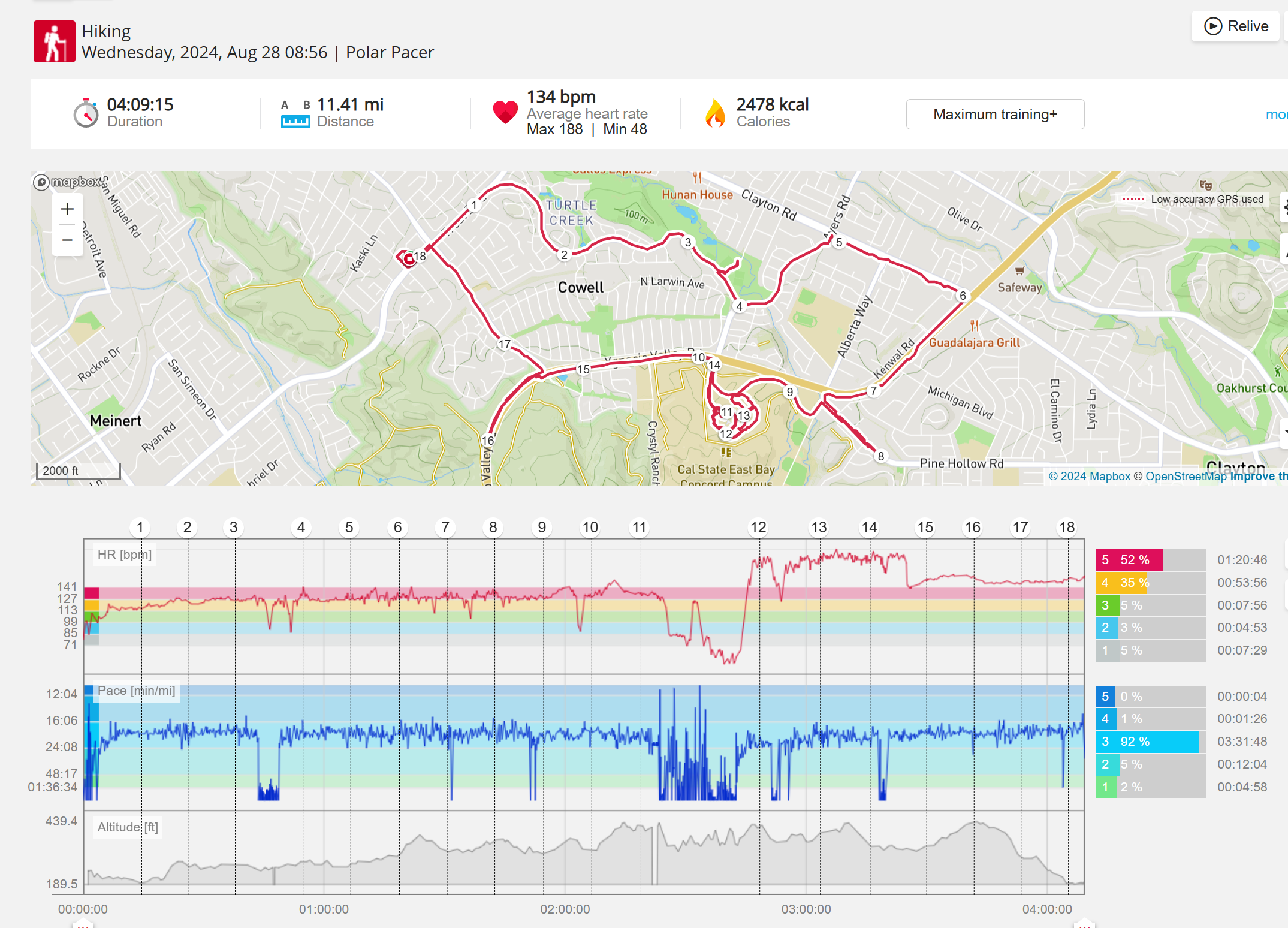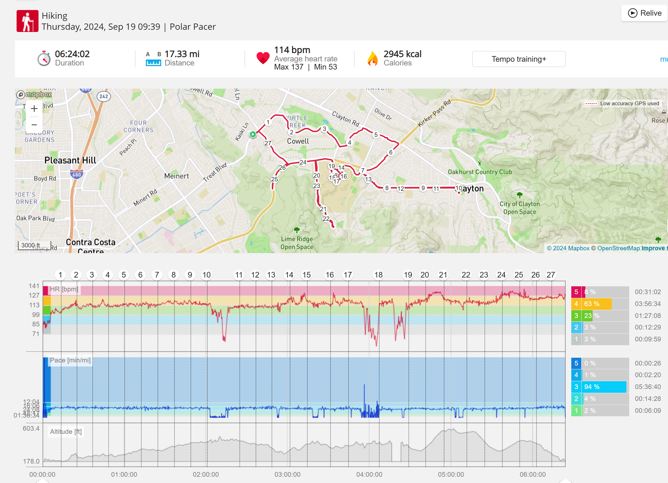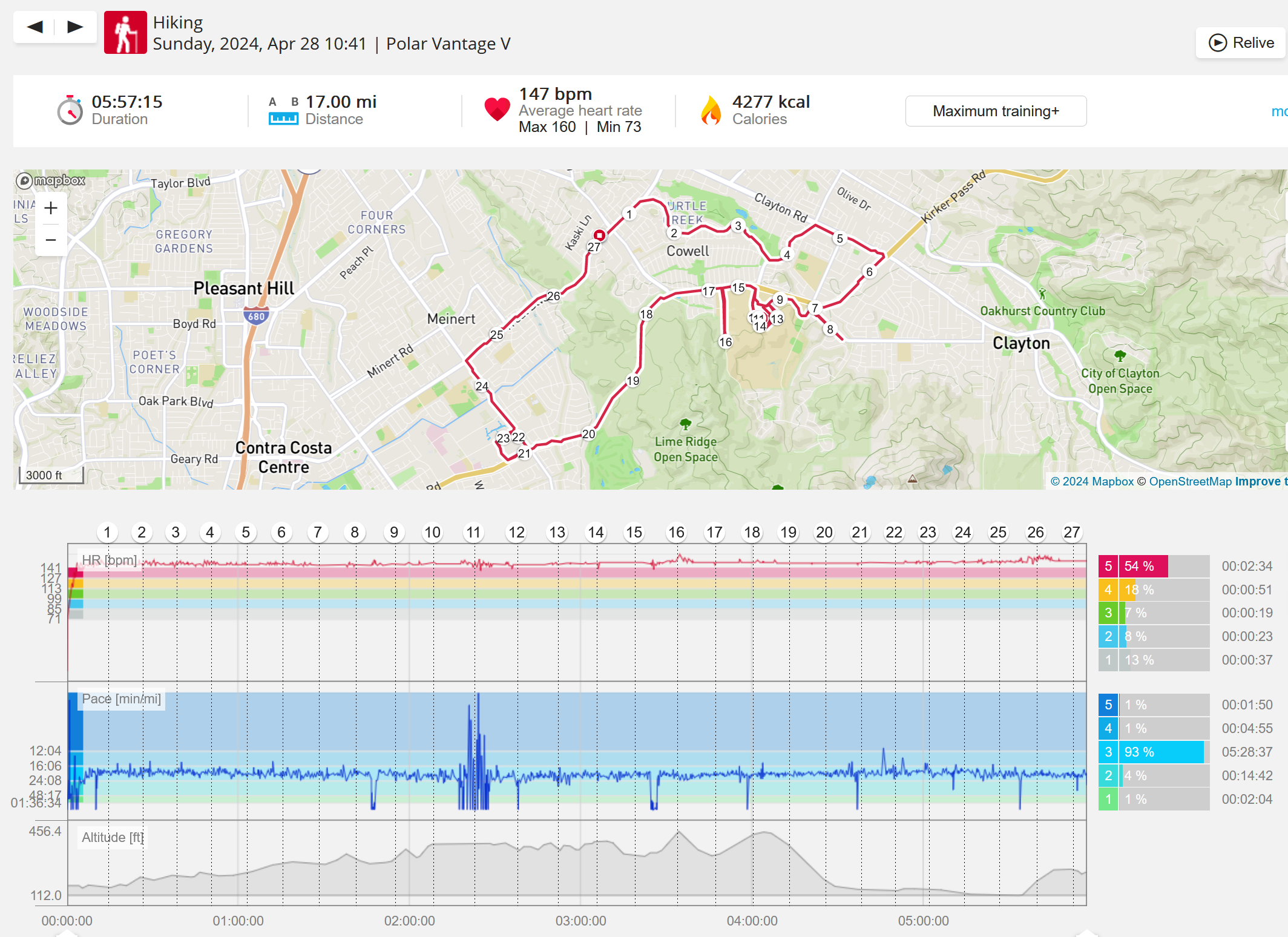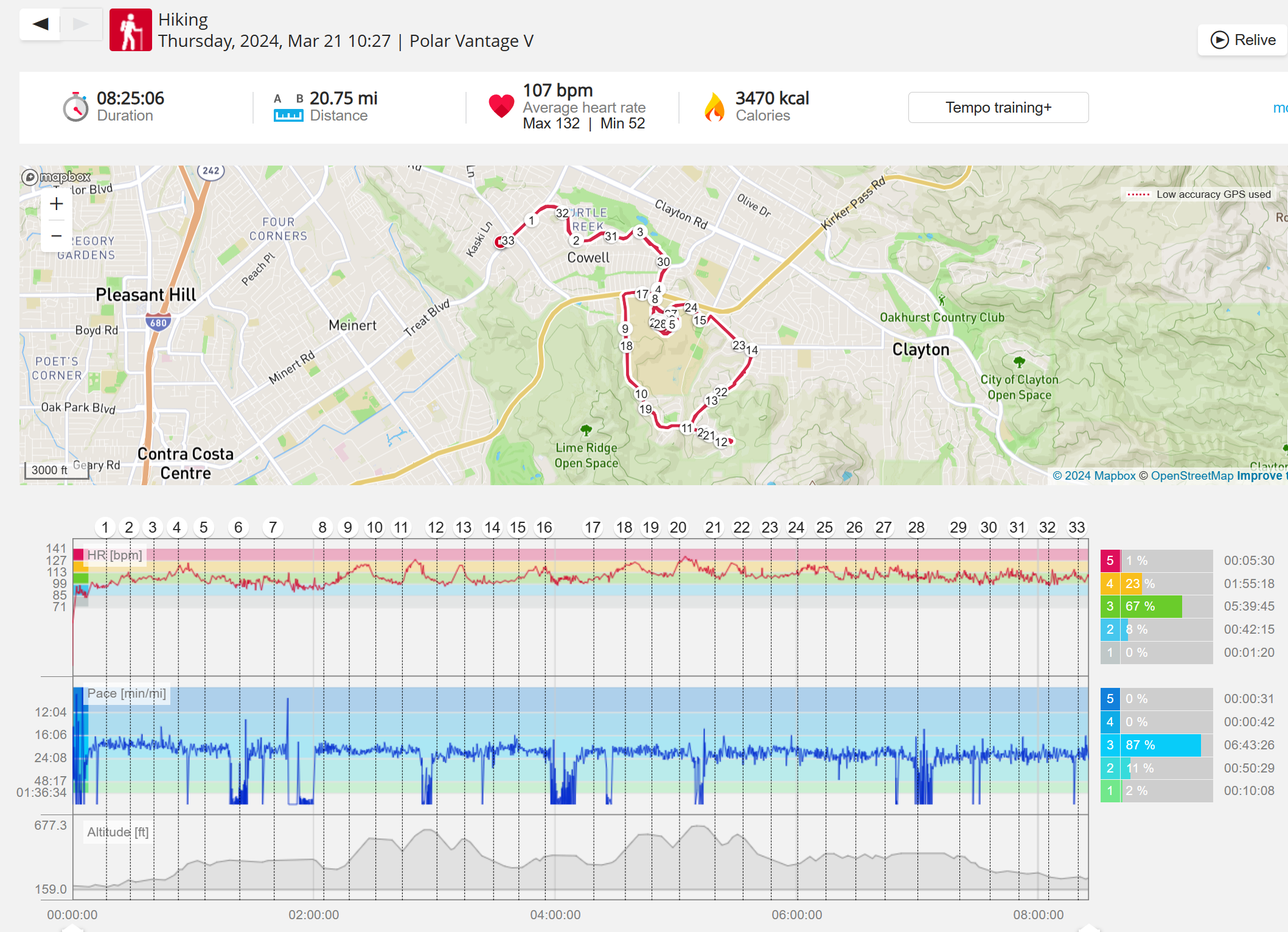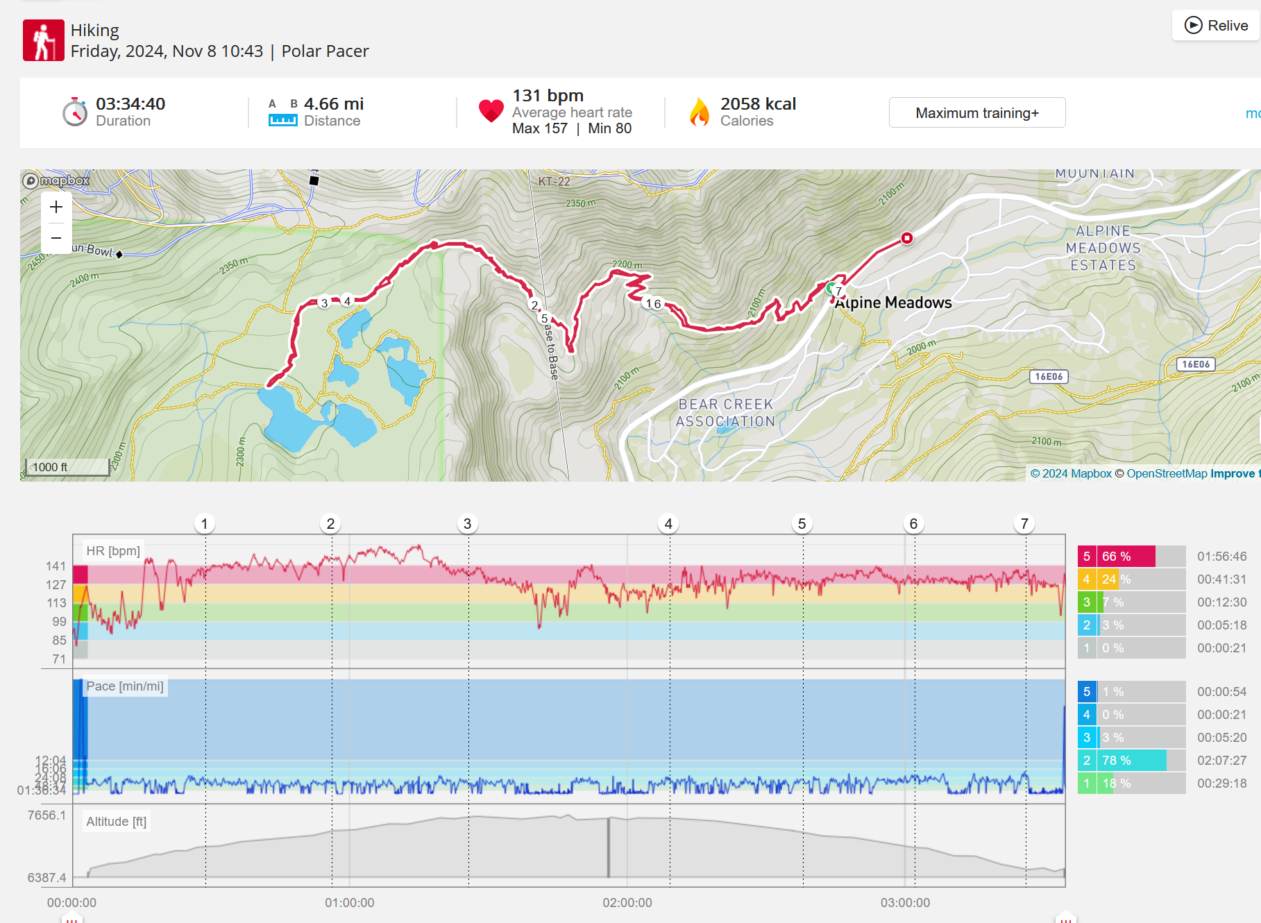 159108 - hiking 00 miles and no continuous extended period steady elevated HR >