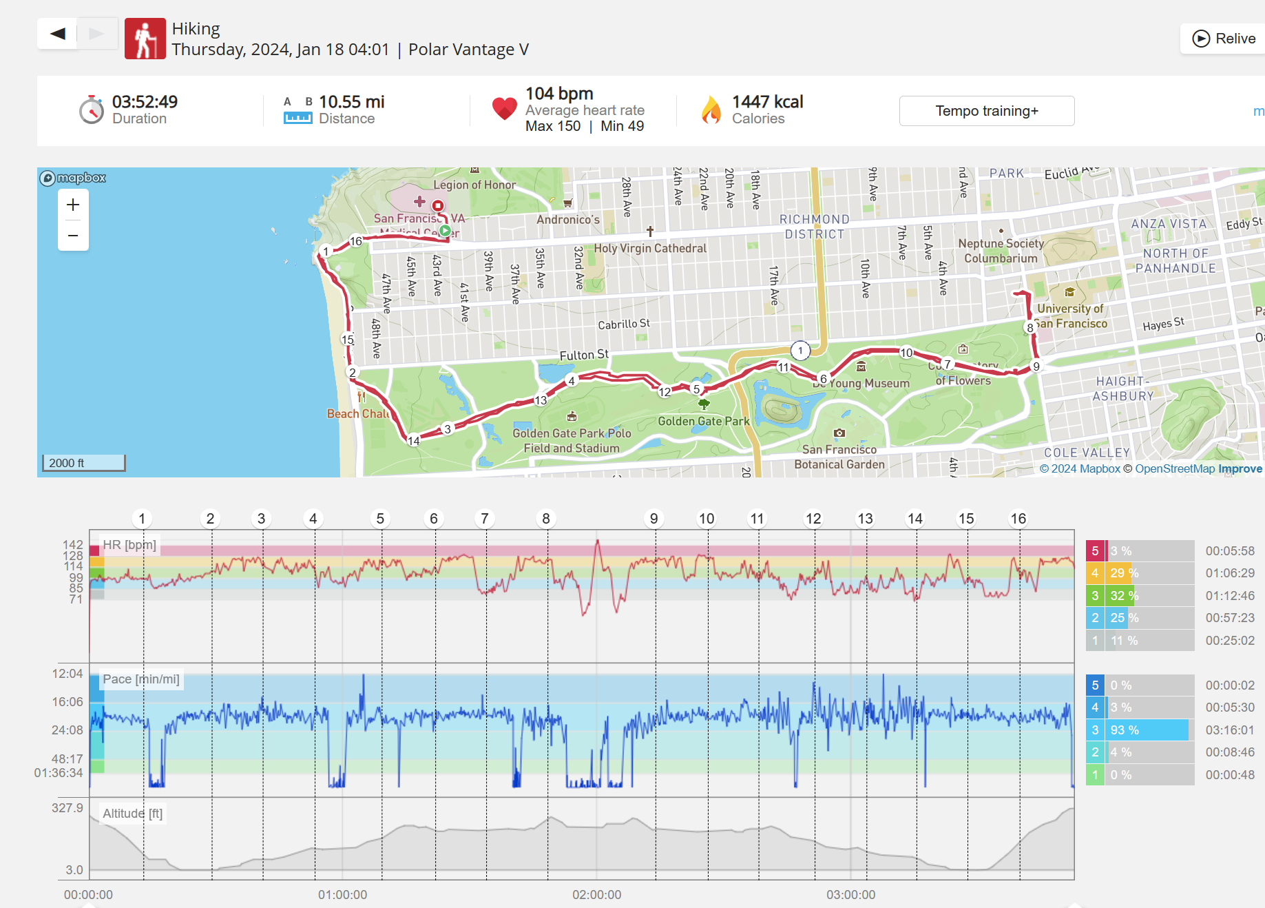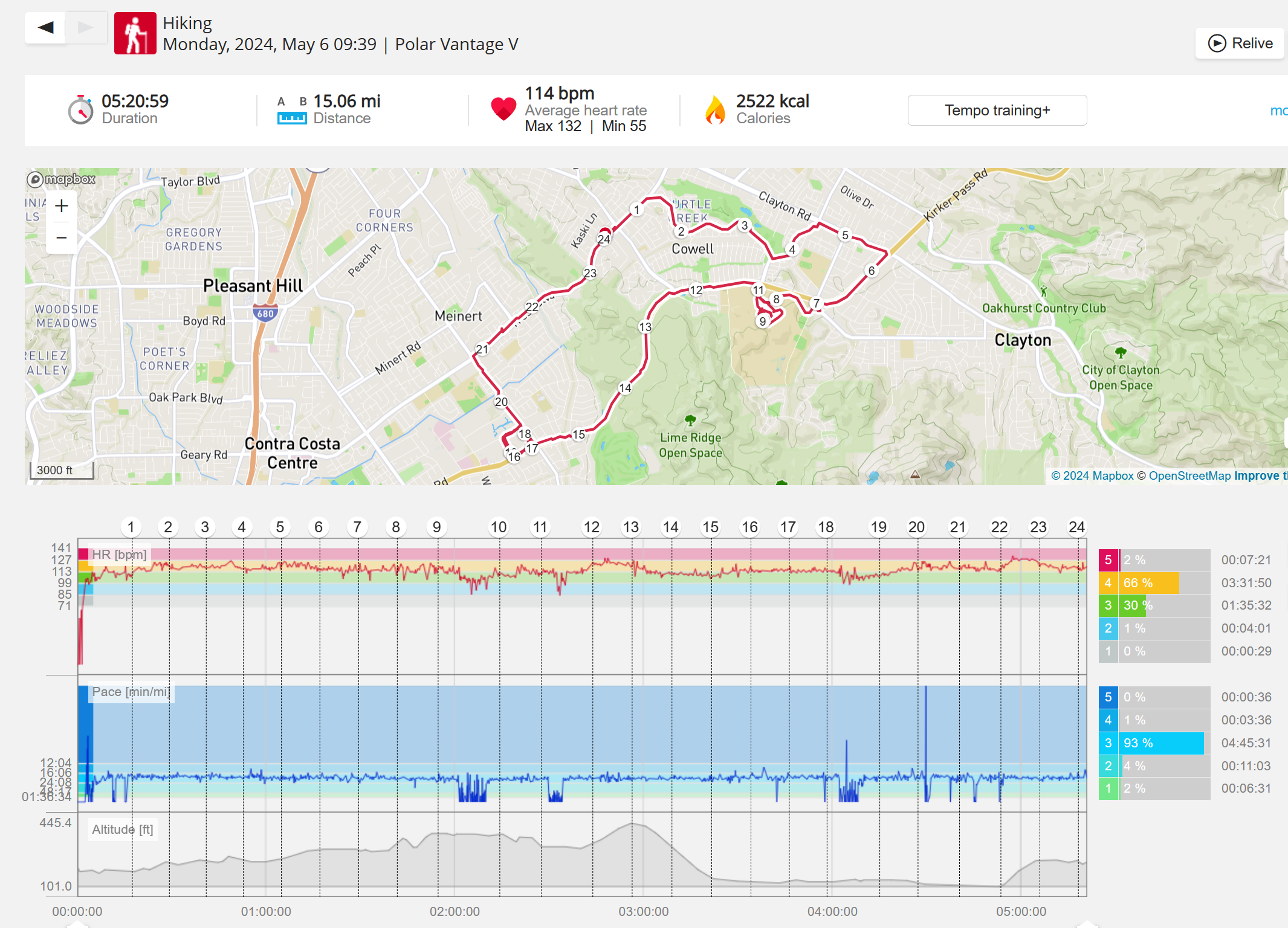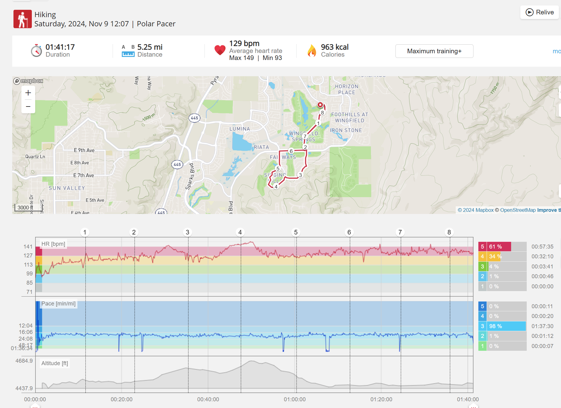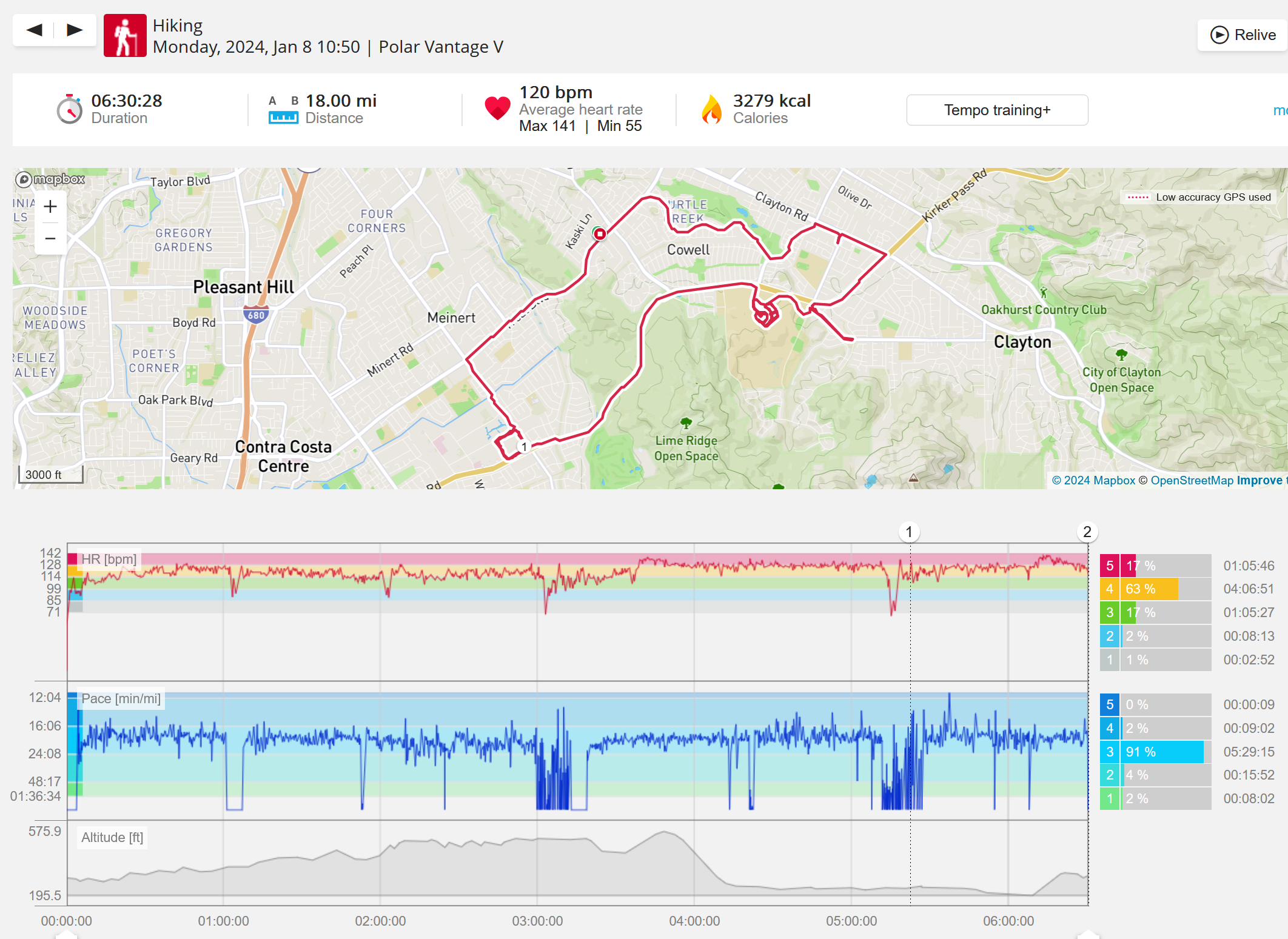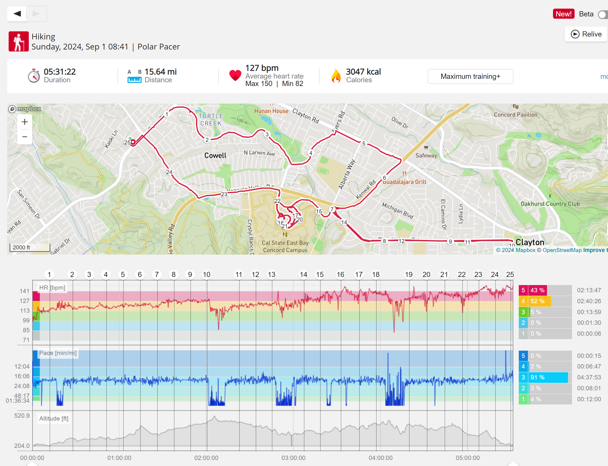 159108 - hiking 00 miles and no continuous extended period steady elevated HR >