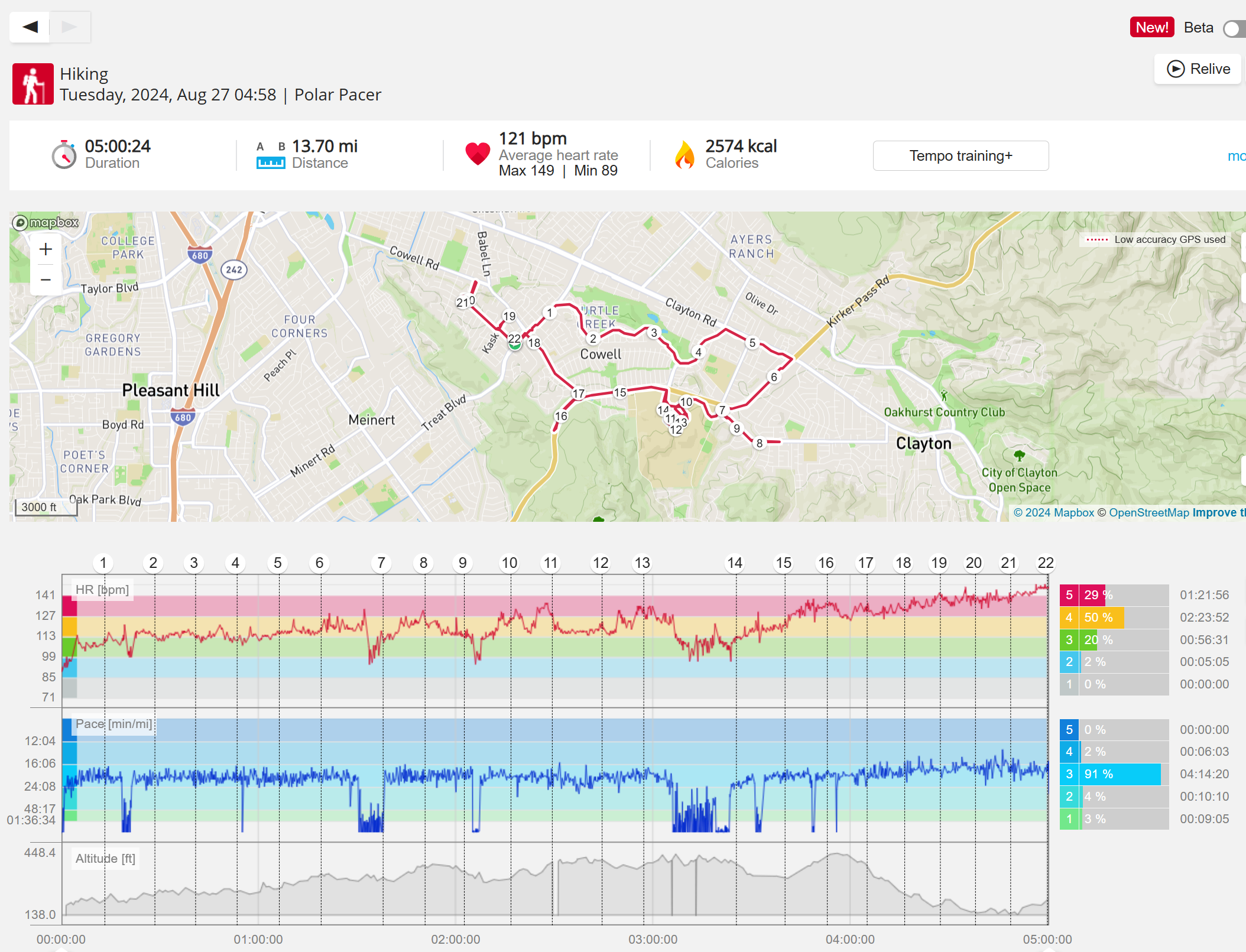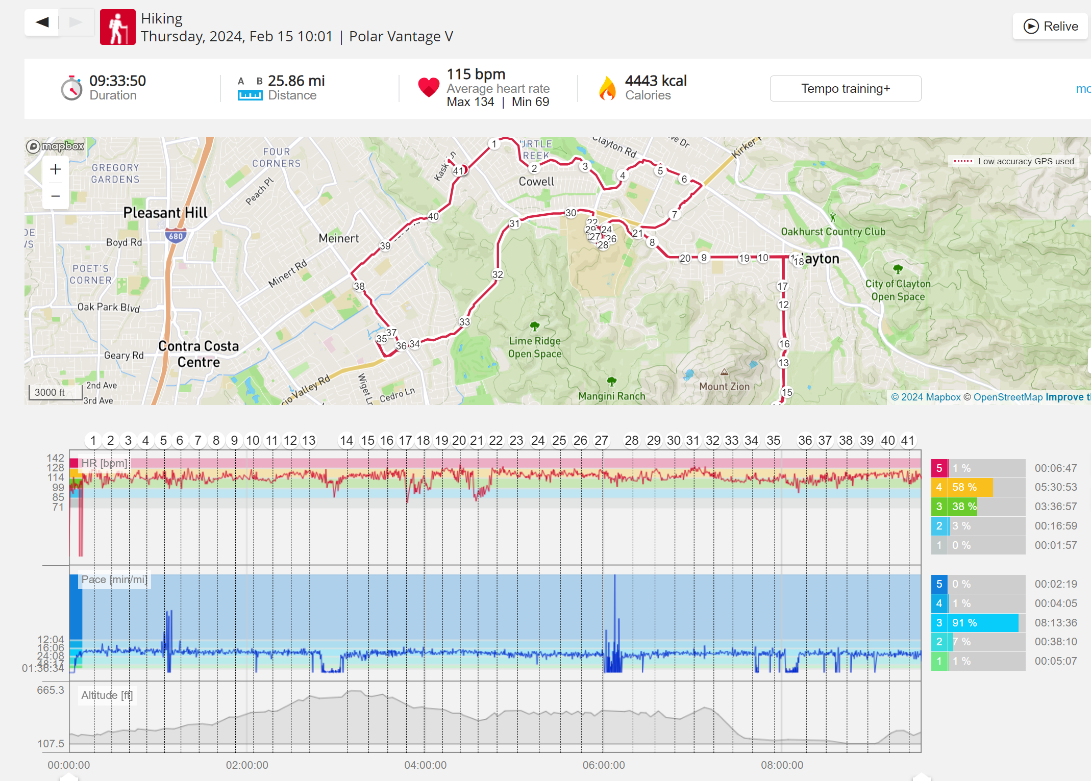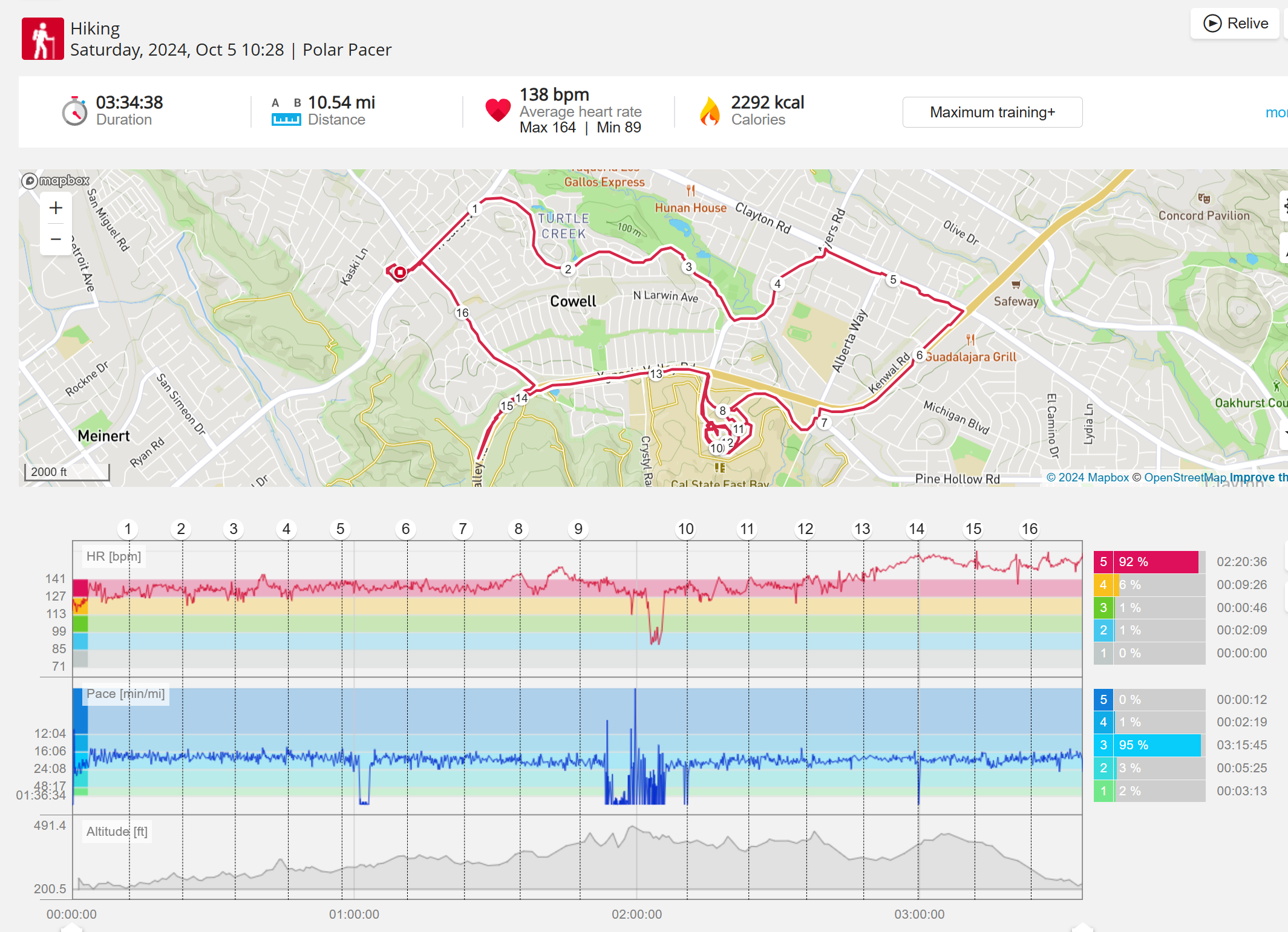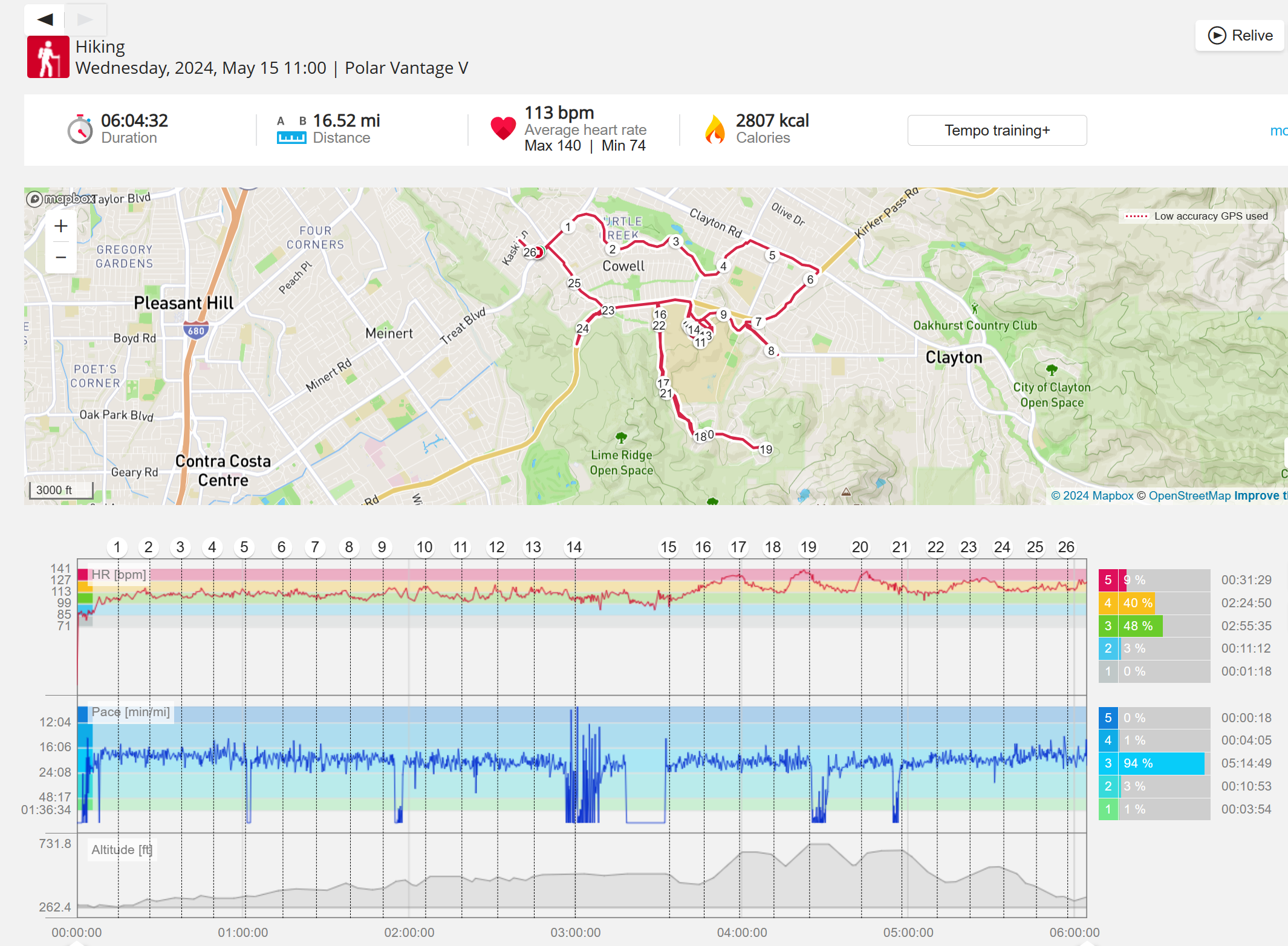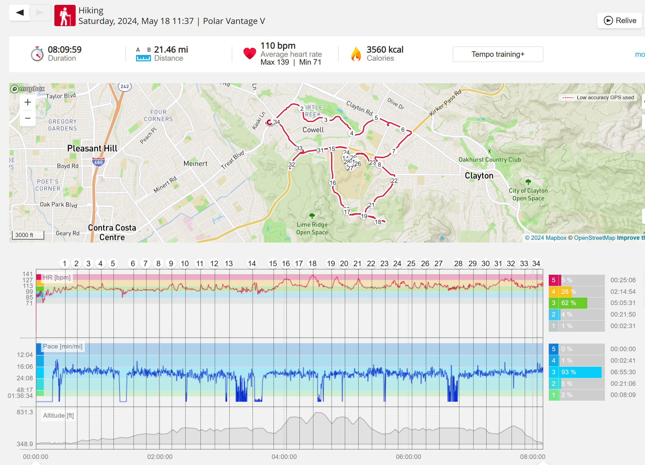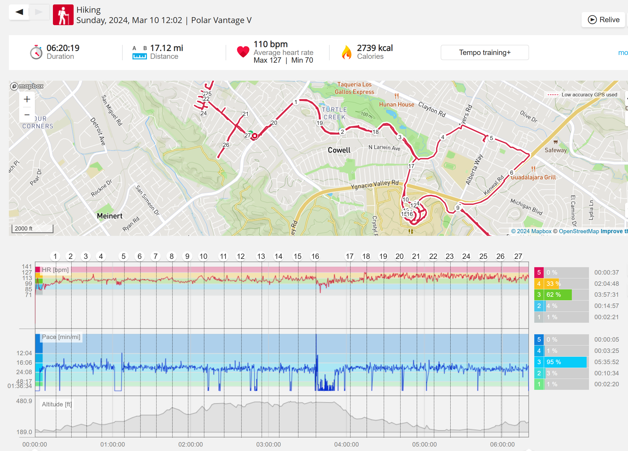 159108 - hiking 00 miles and no continuous extended period steady elevated HR >