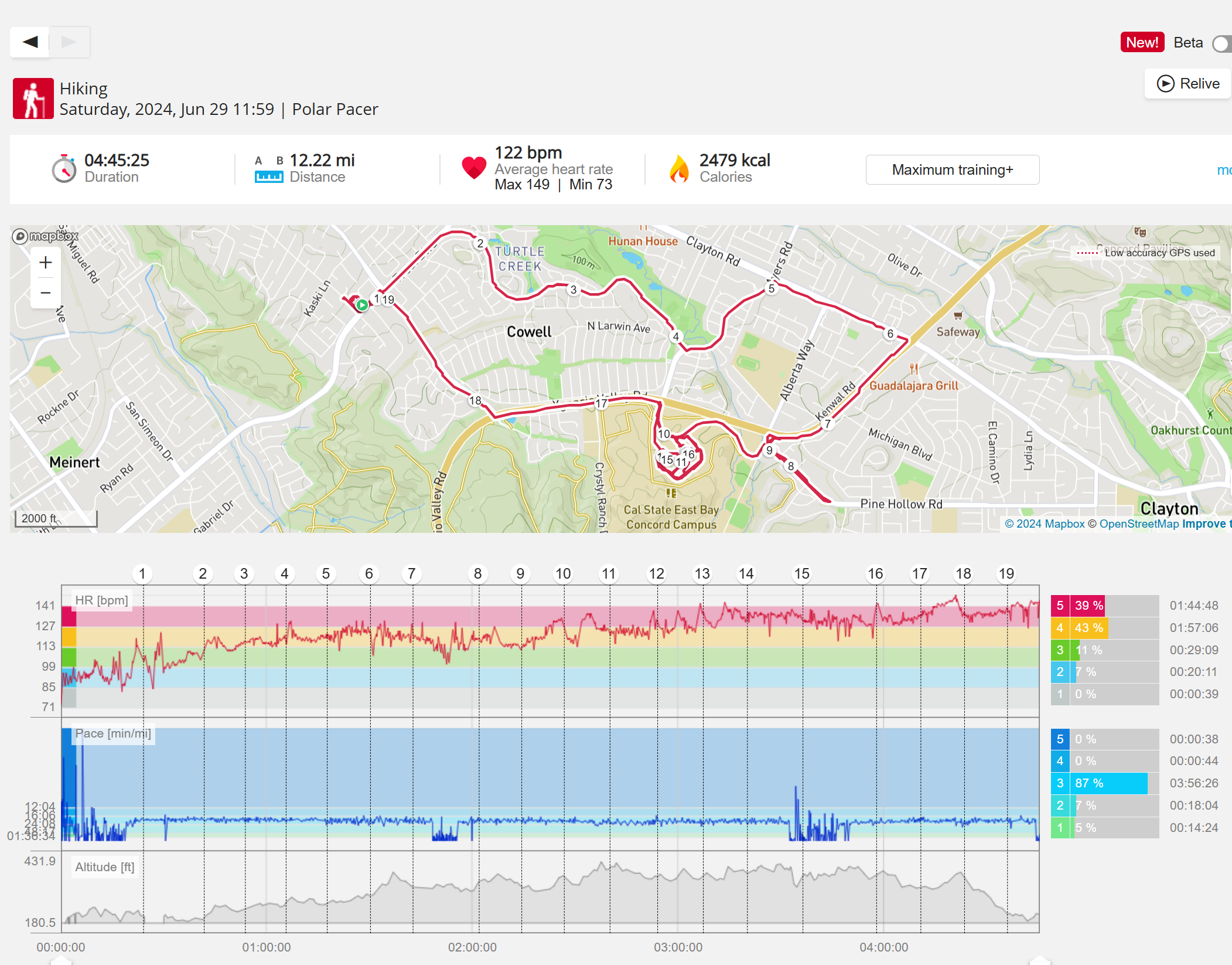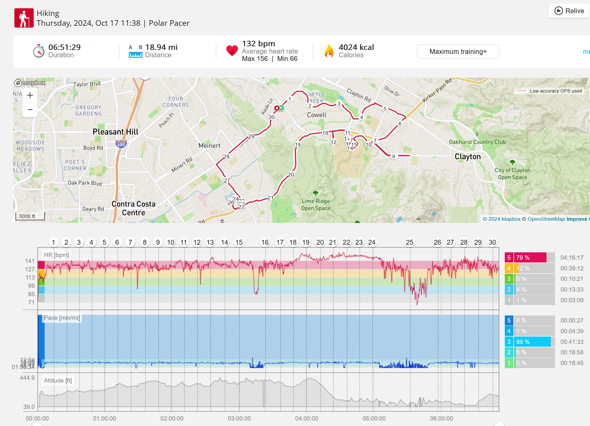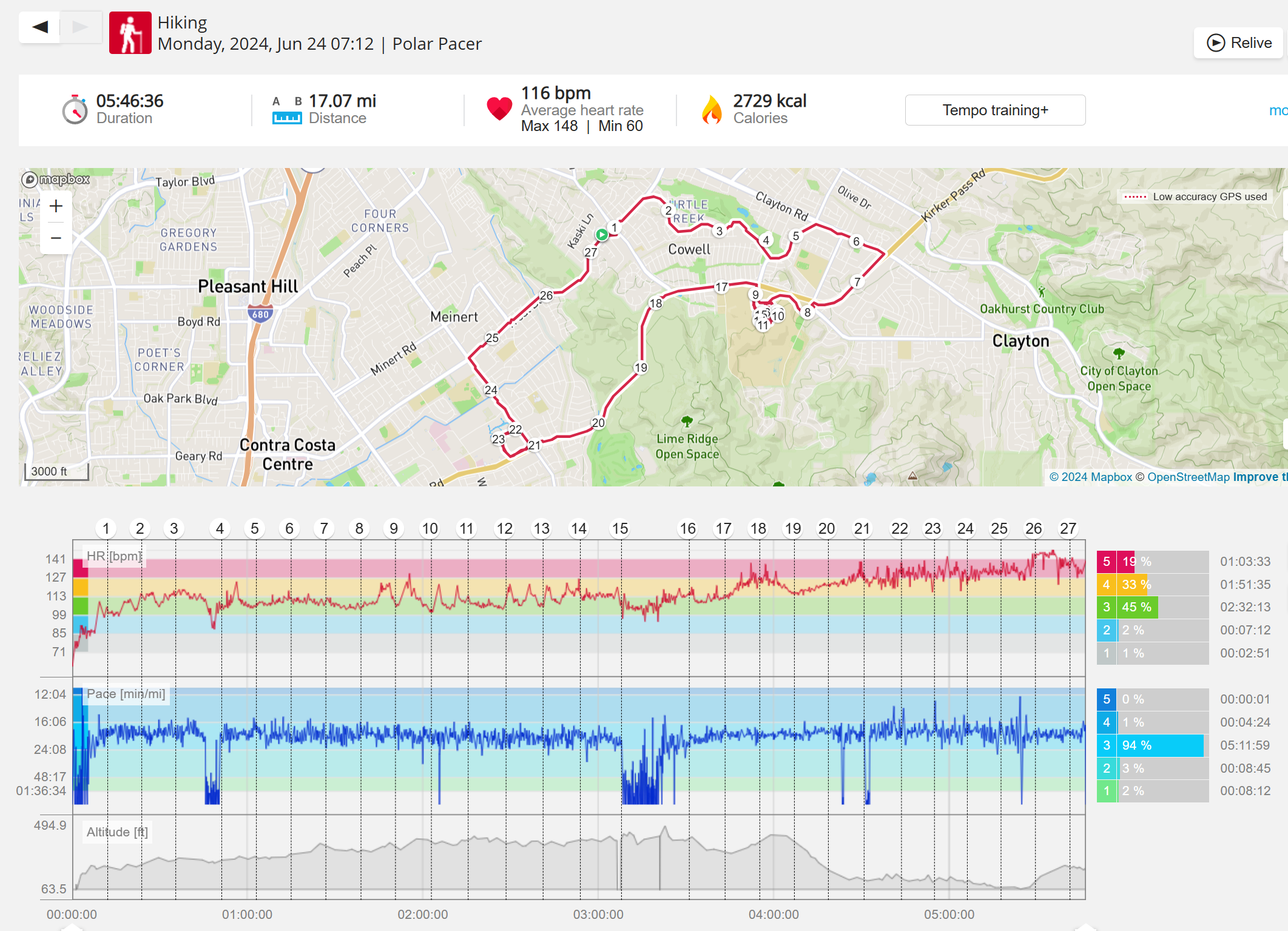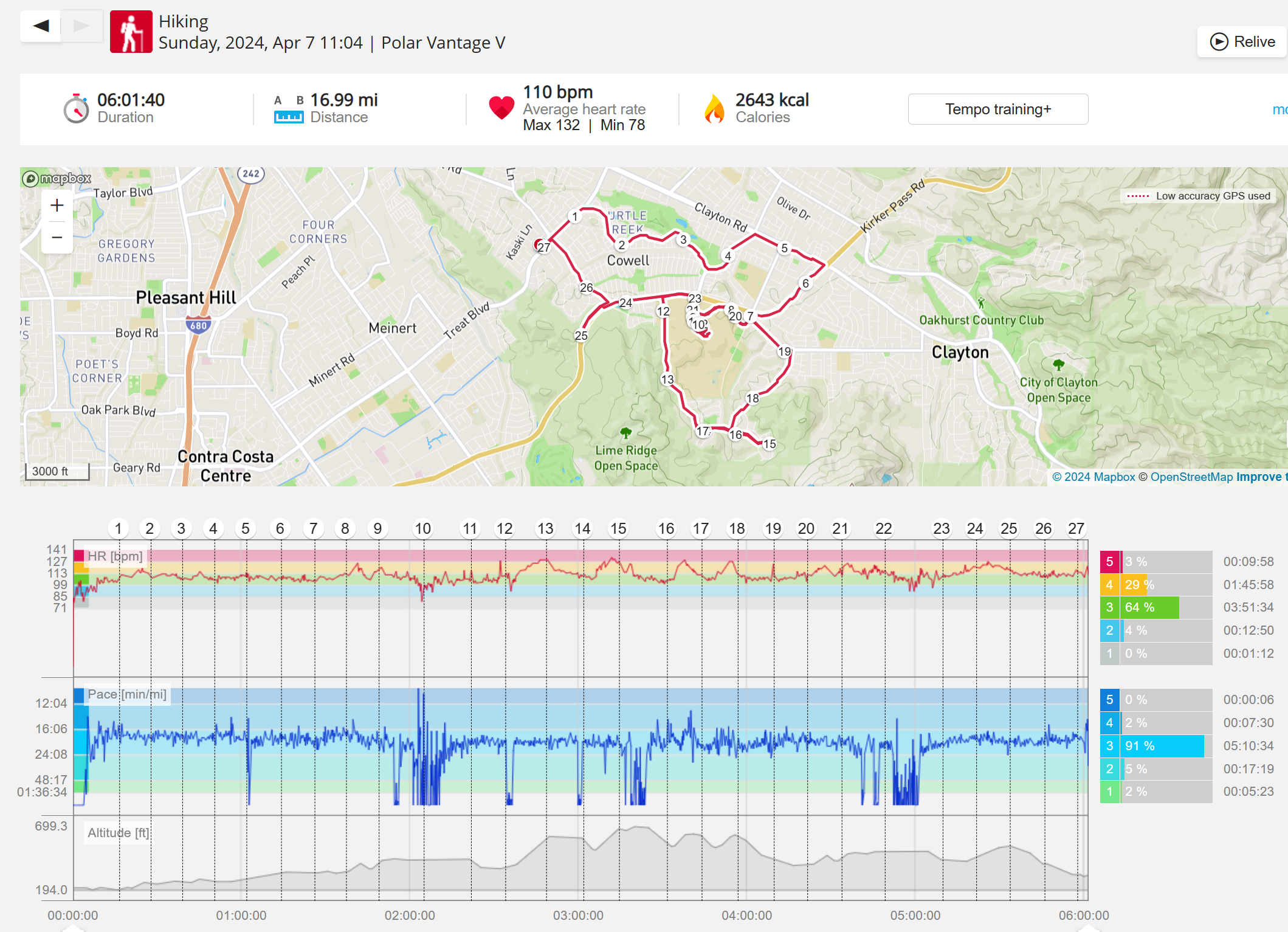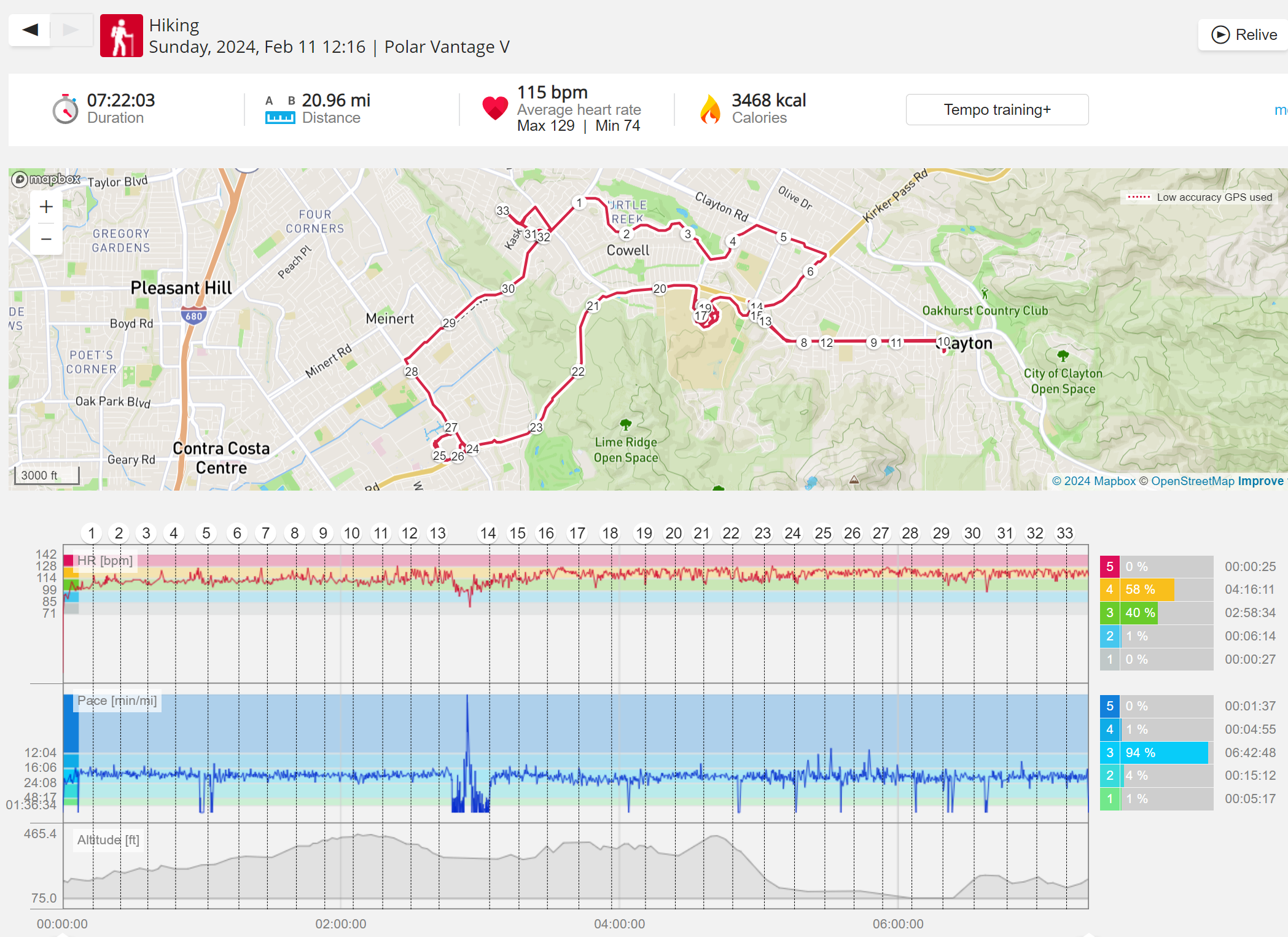 159108 - hiking 00 miles and no continuous extended period steady elevated HR >