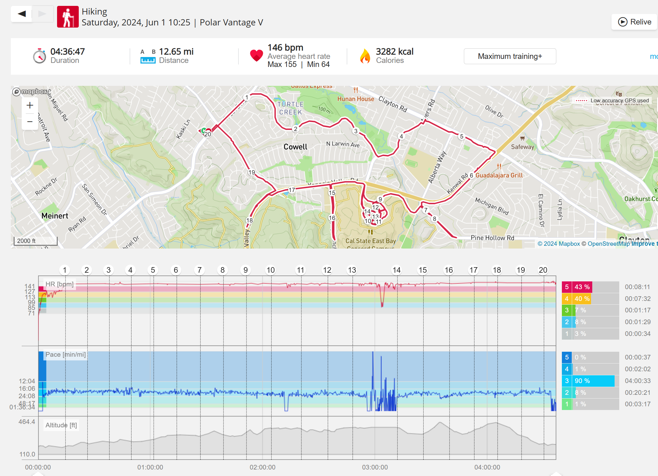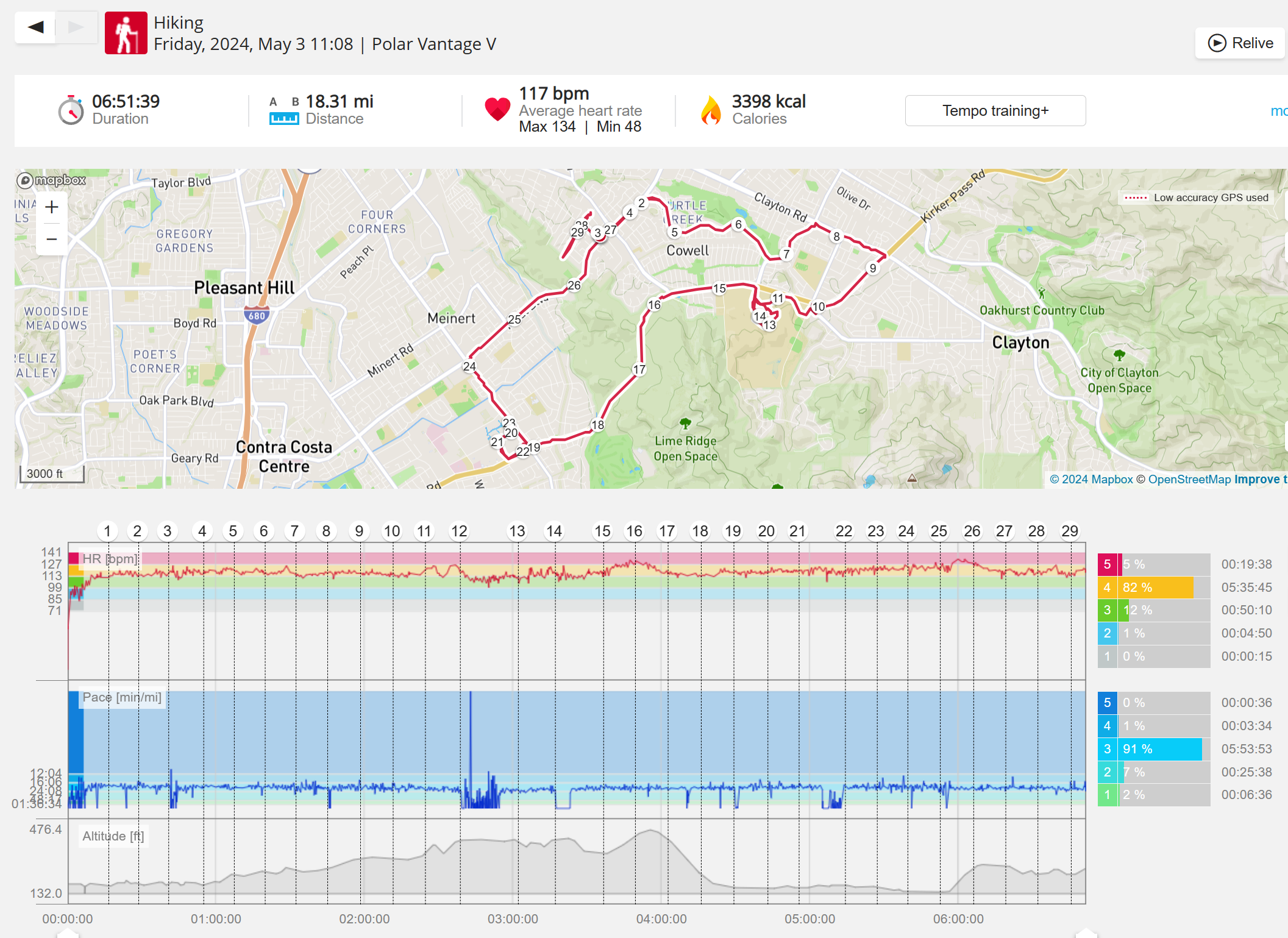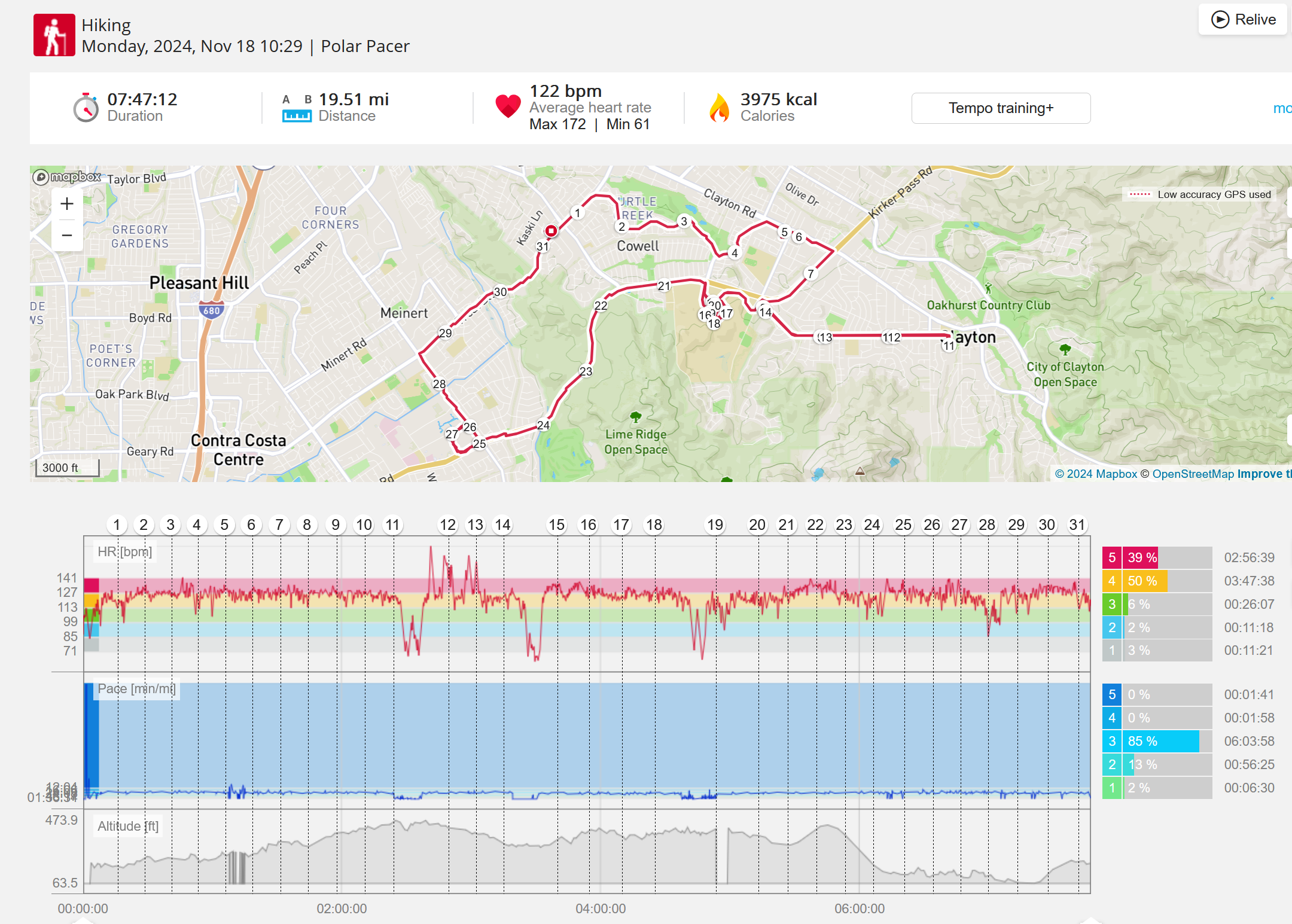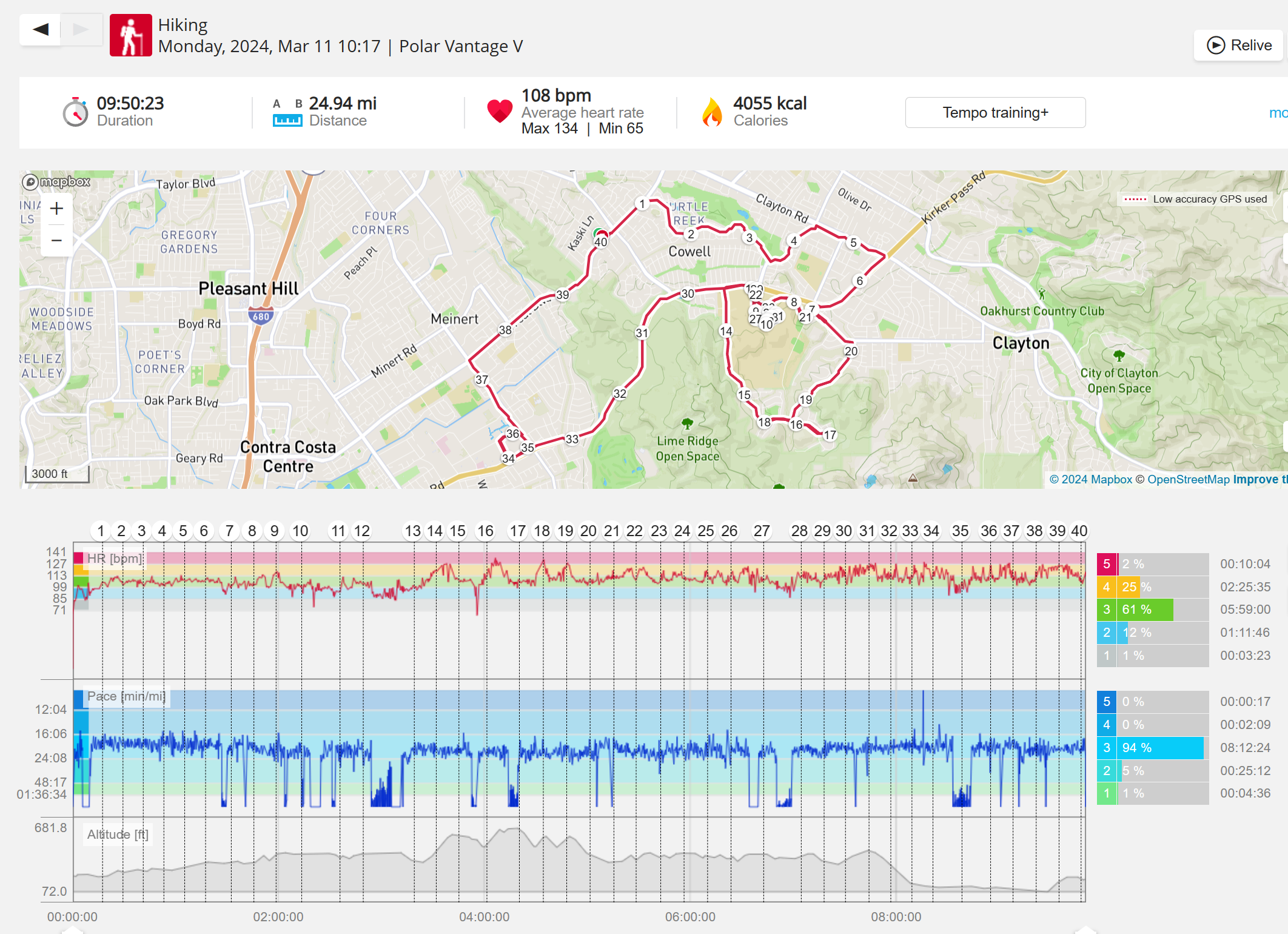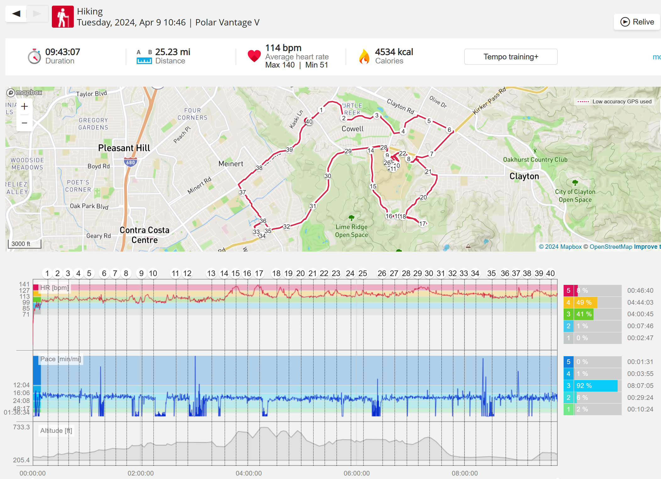 159108 - hiking 00 miles and no continuous extended period steady elevated HR >