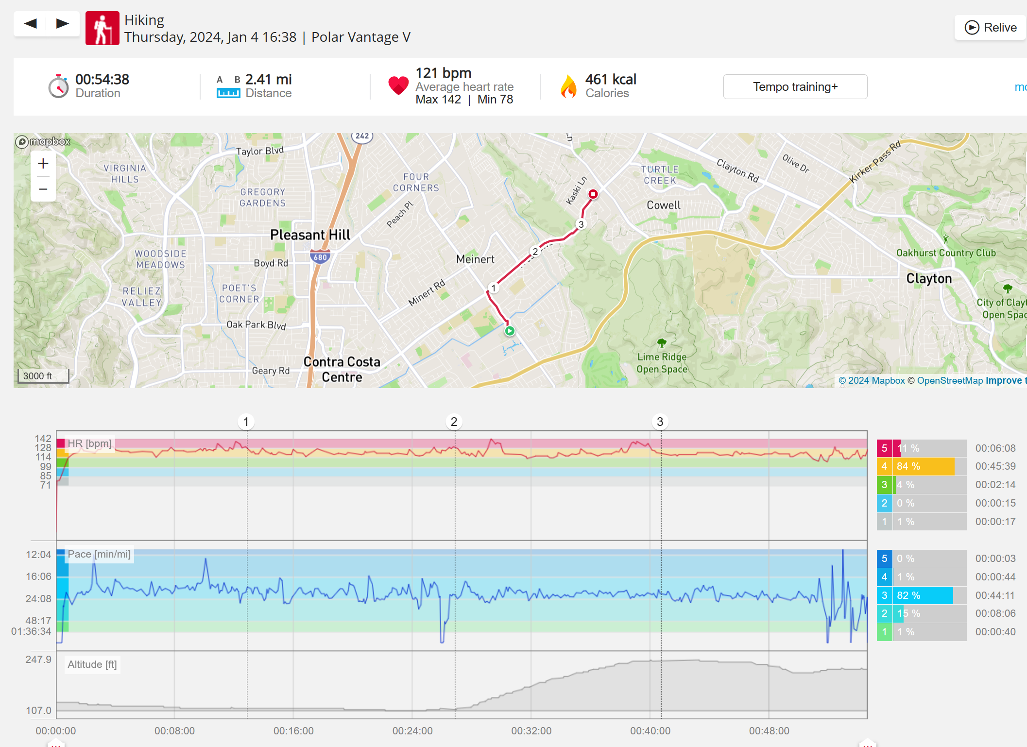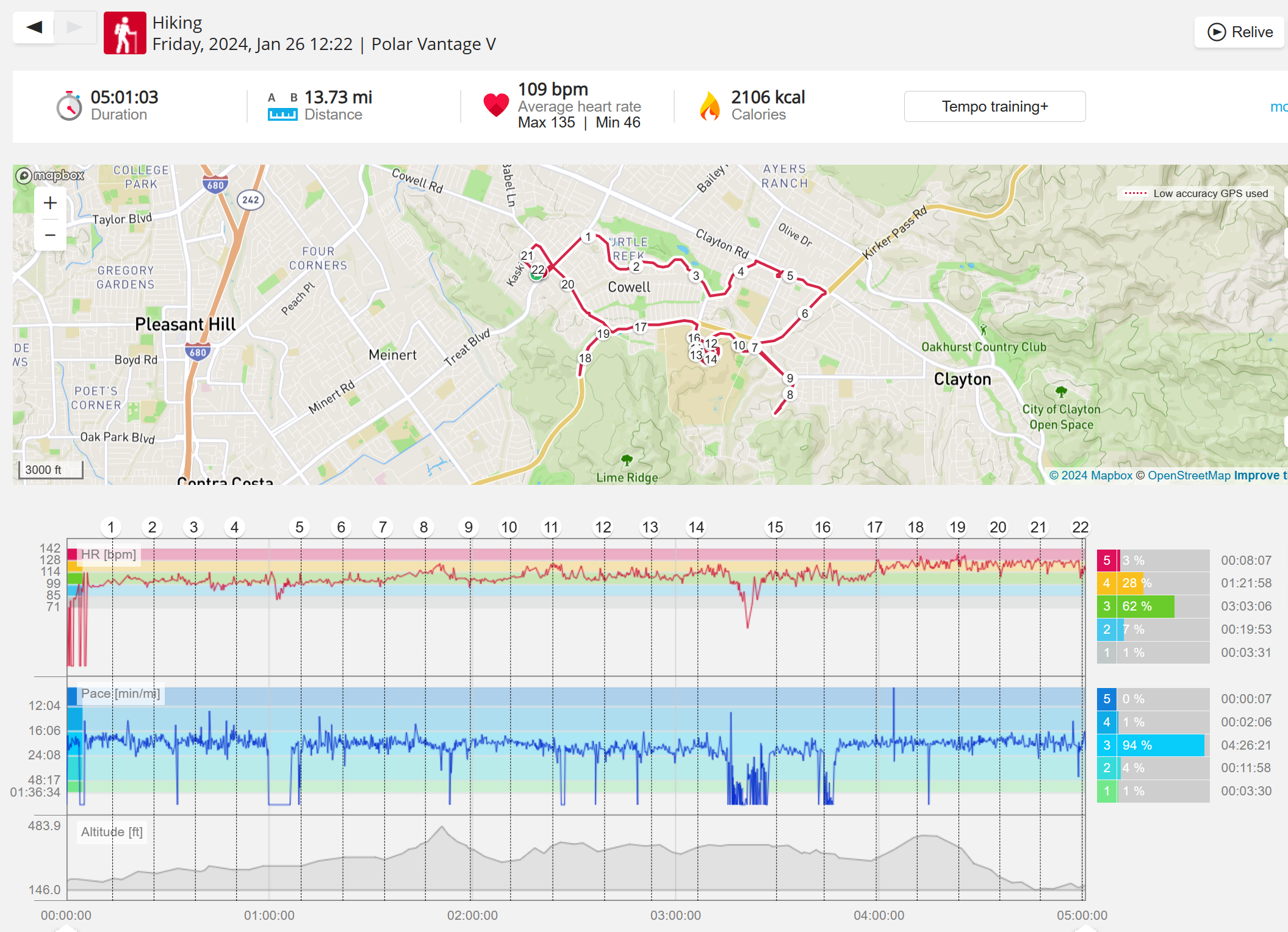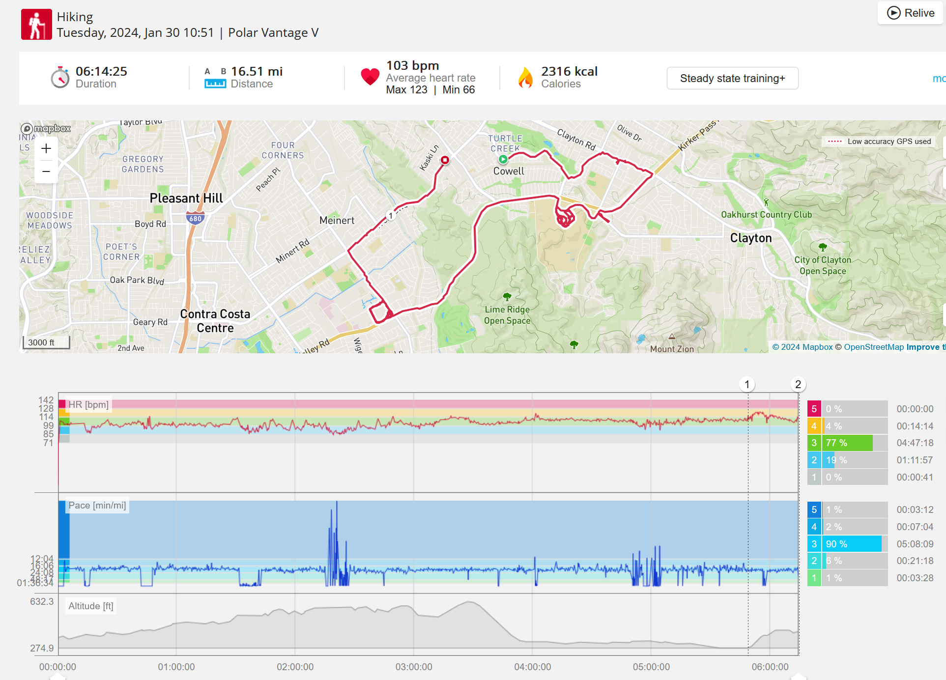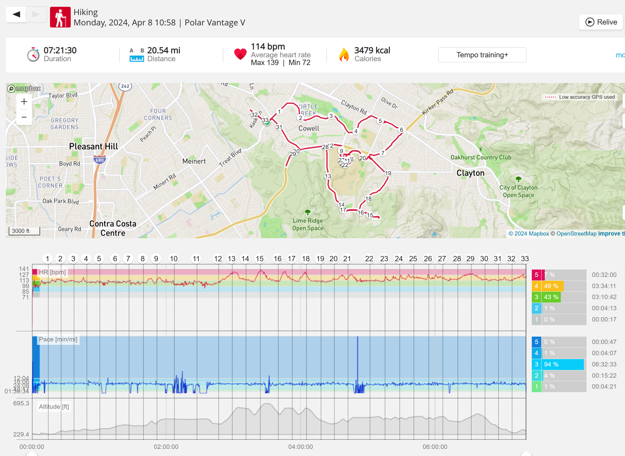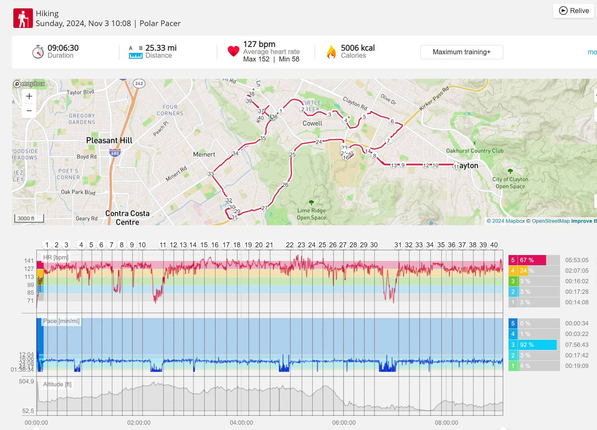 159108 - hiking 00 miles and no continuous extended period steady elevated HR >