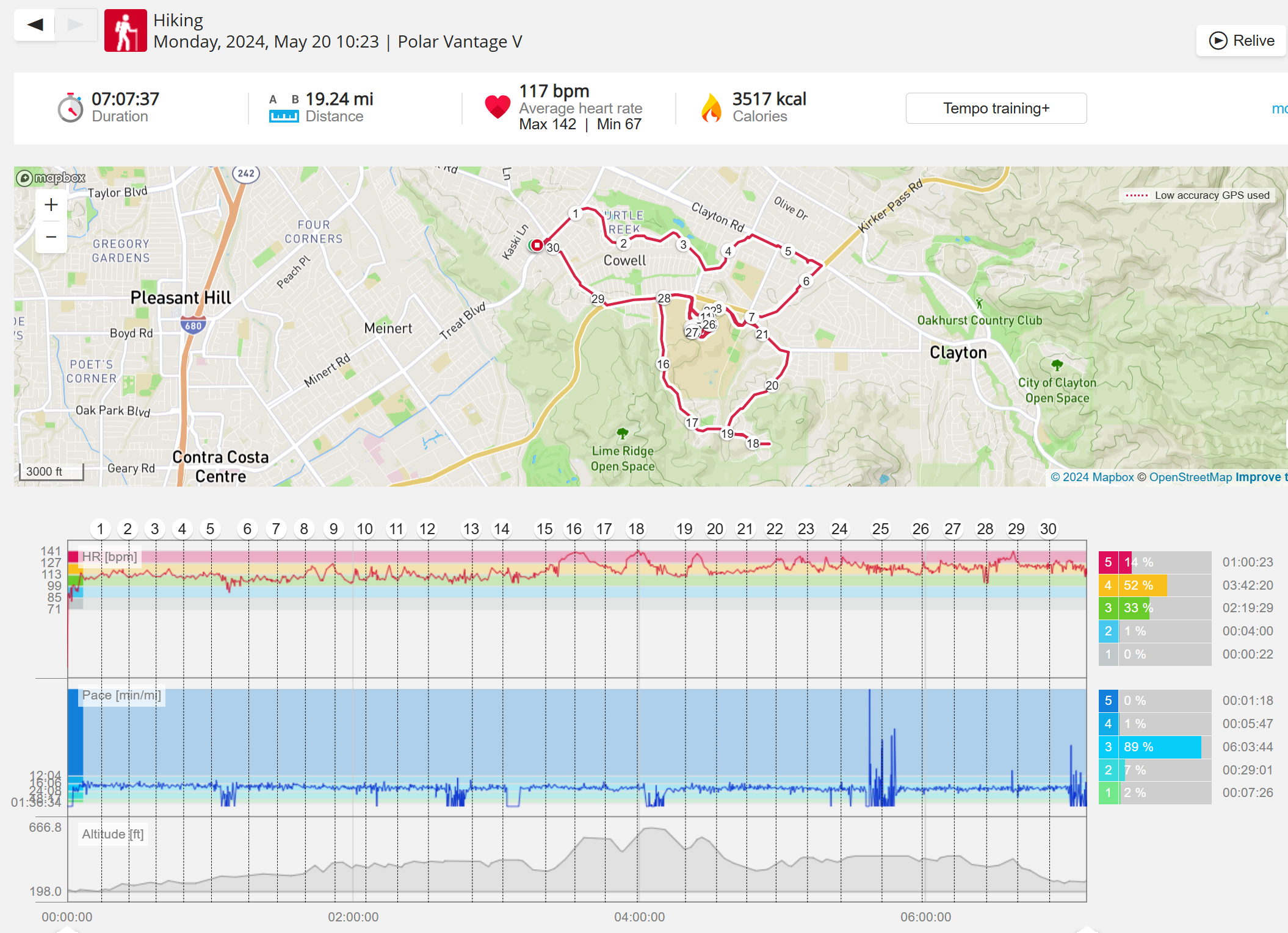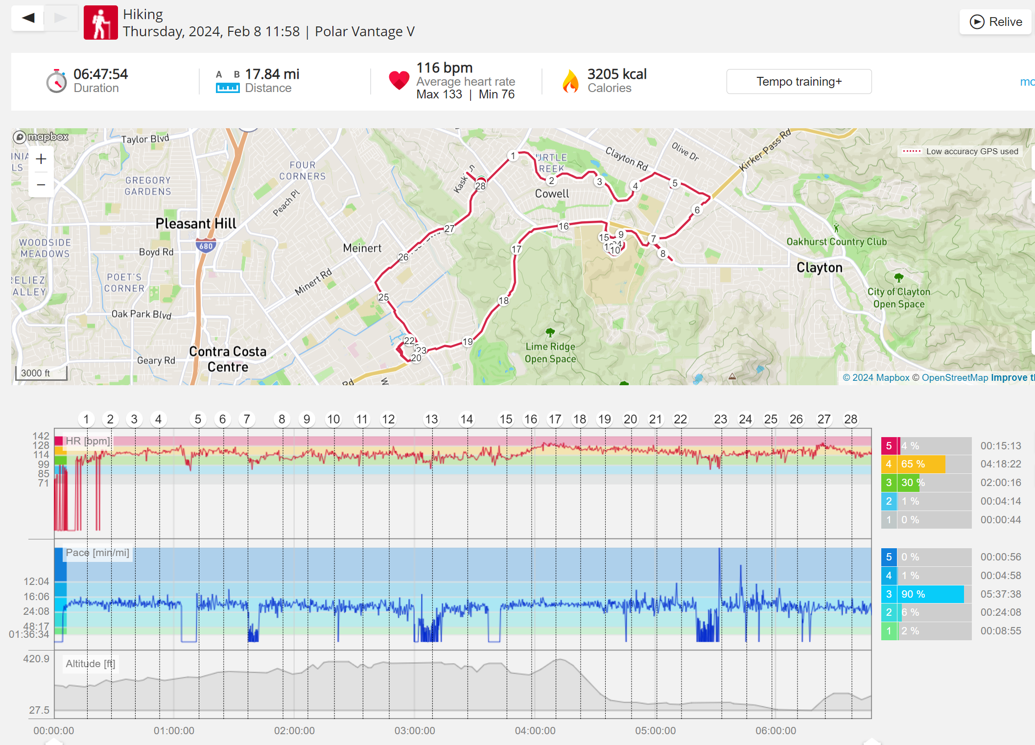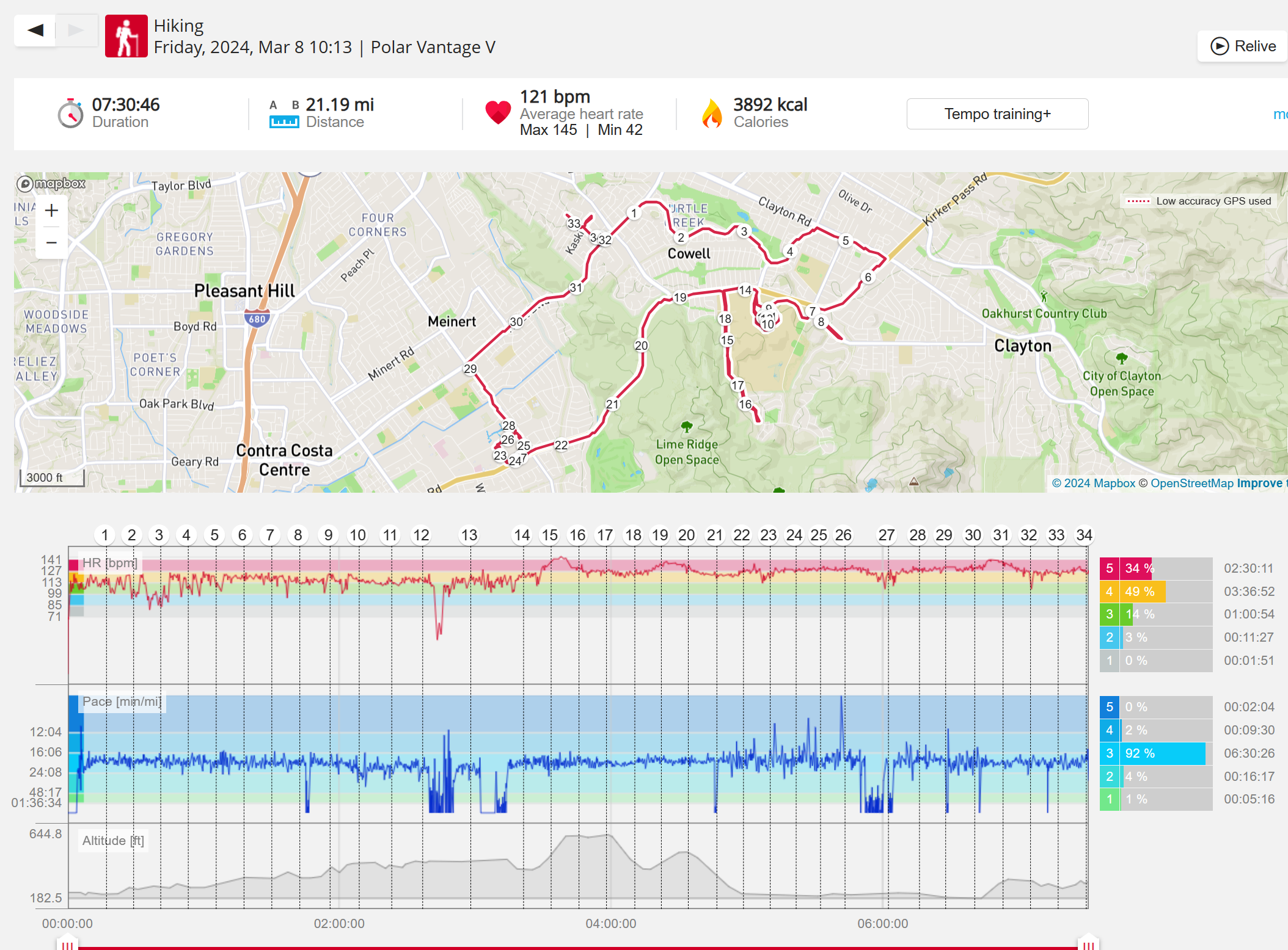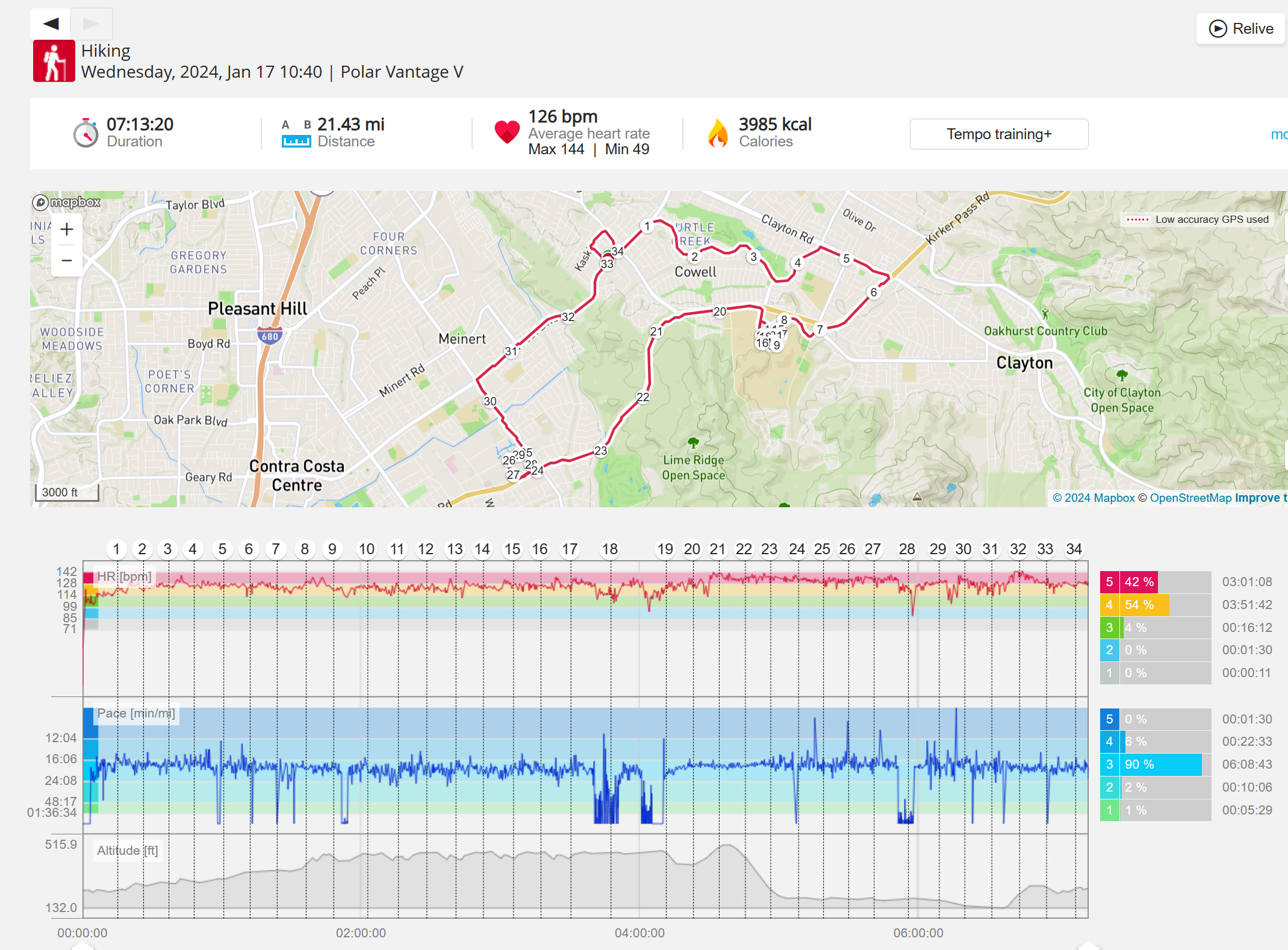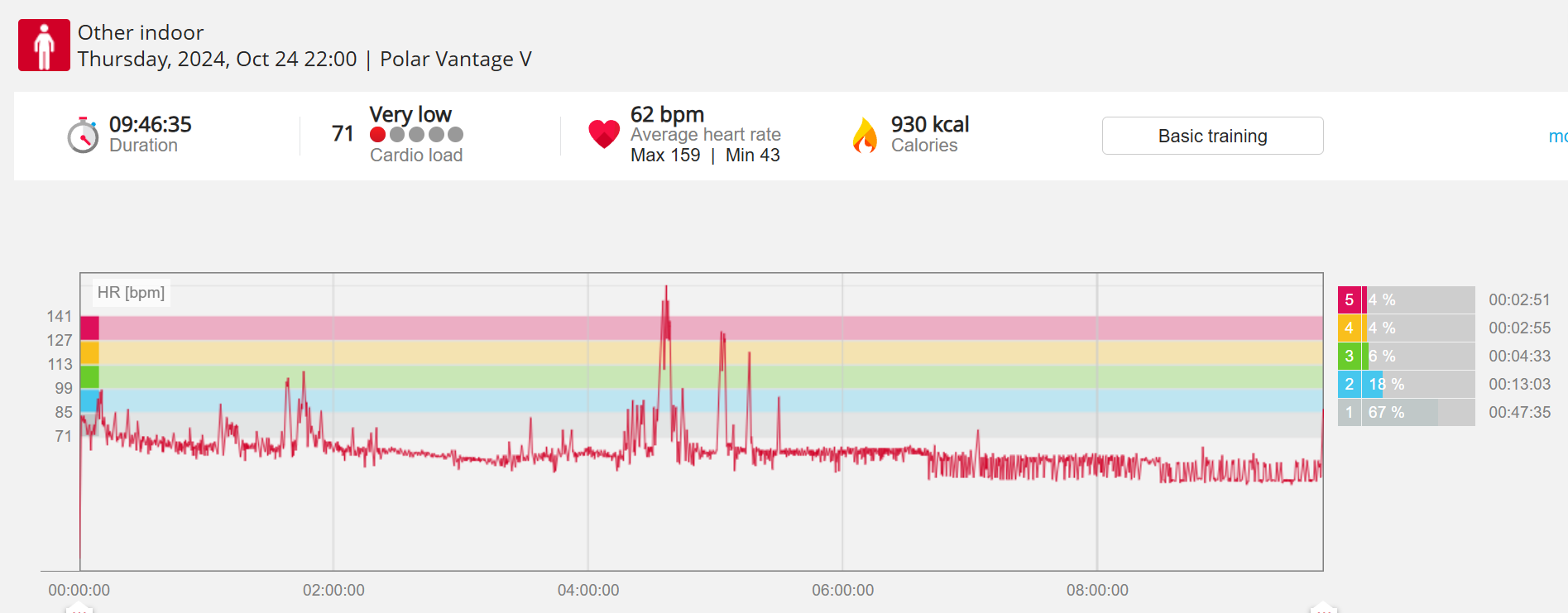 159108 - hiking 00 miles and no continuous extended period steady elevated HR >
